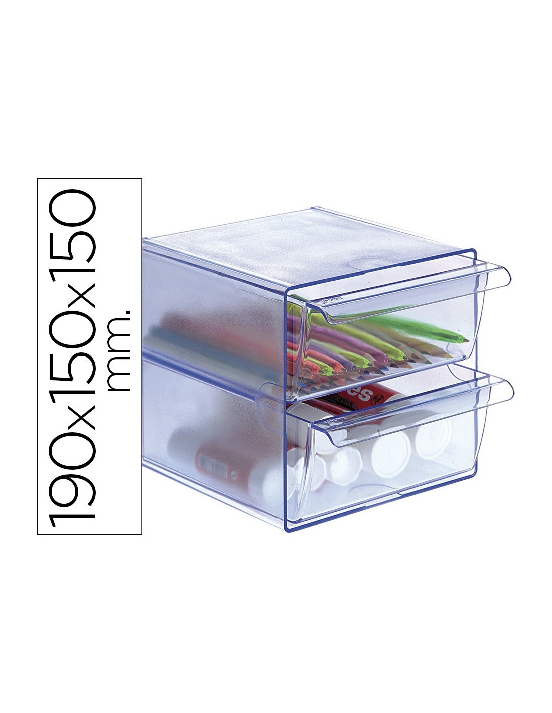 Organizador modular apilable Archivo 2000 Archicubo compuesto por 2 cajones de 135mm cada uno. Fabricado en poliestireno transparente. Incluye 2 clips de sujeción que permiten unir los diferentes organizadores y formar estructuras a tu medida. Fabricados en poliamida, no contine sustancias tóxicas. Todos los cajones son extraíbles y de apertura independiente. Color azul transparente. Medidas interiores cajón: 145 x 135 x 65 mm. Medidas exteriores: 190x150x150 mm. Fabricado en España.