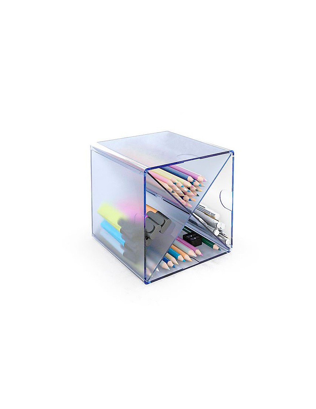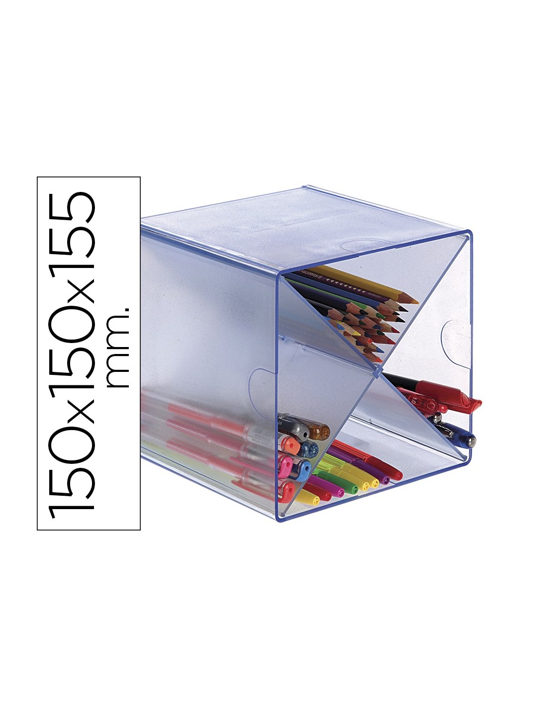 Organizador modular apilable Archivo 2000 Archicubo compuesto por 4 compartimentos con divisor en aspa. Fabricado en poliestireno transparente. Incluye 2 clips de sujeción que permiten unir los diferentes organizadores y formar estructuras a tu medida. Fabricados en poliamida, no contine sustancias tóxicas. Ideales para colocar en estanterías, armarios o cajones. Color azul transparente. Medidas exteriores: 150x150x150 mm. Fabricado en España