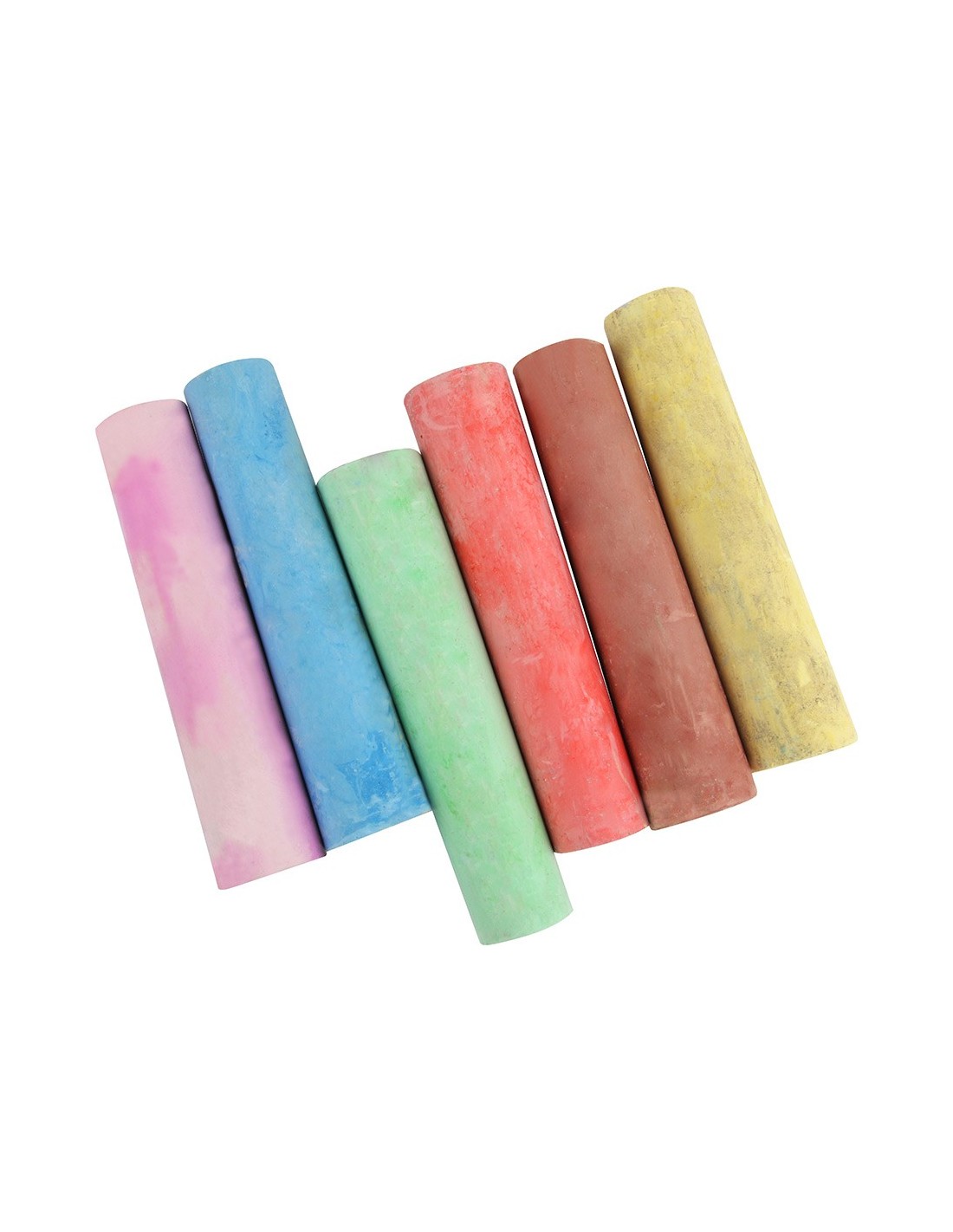 Tiza para suelo en diferentes colores. Ideal para actividades creativas y/o escolares. No recomendada para menores de 3 años. Caja de 6 unidades: 1 tiza amarilla, 1 azul, 1 marrón, 1 roja, 1 rosa y 1 verde.