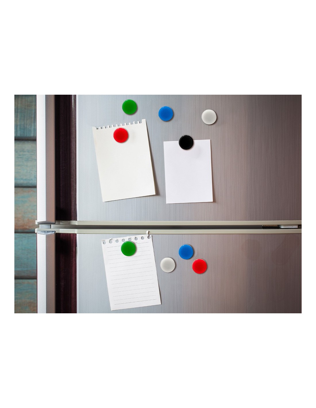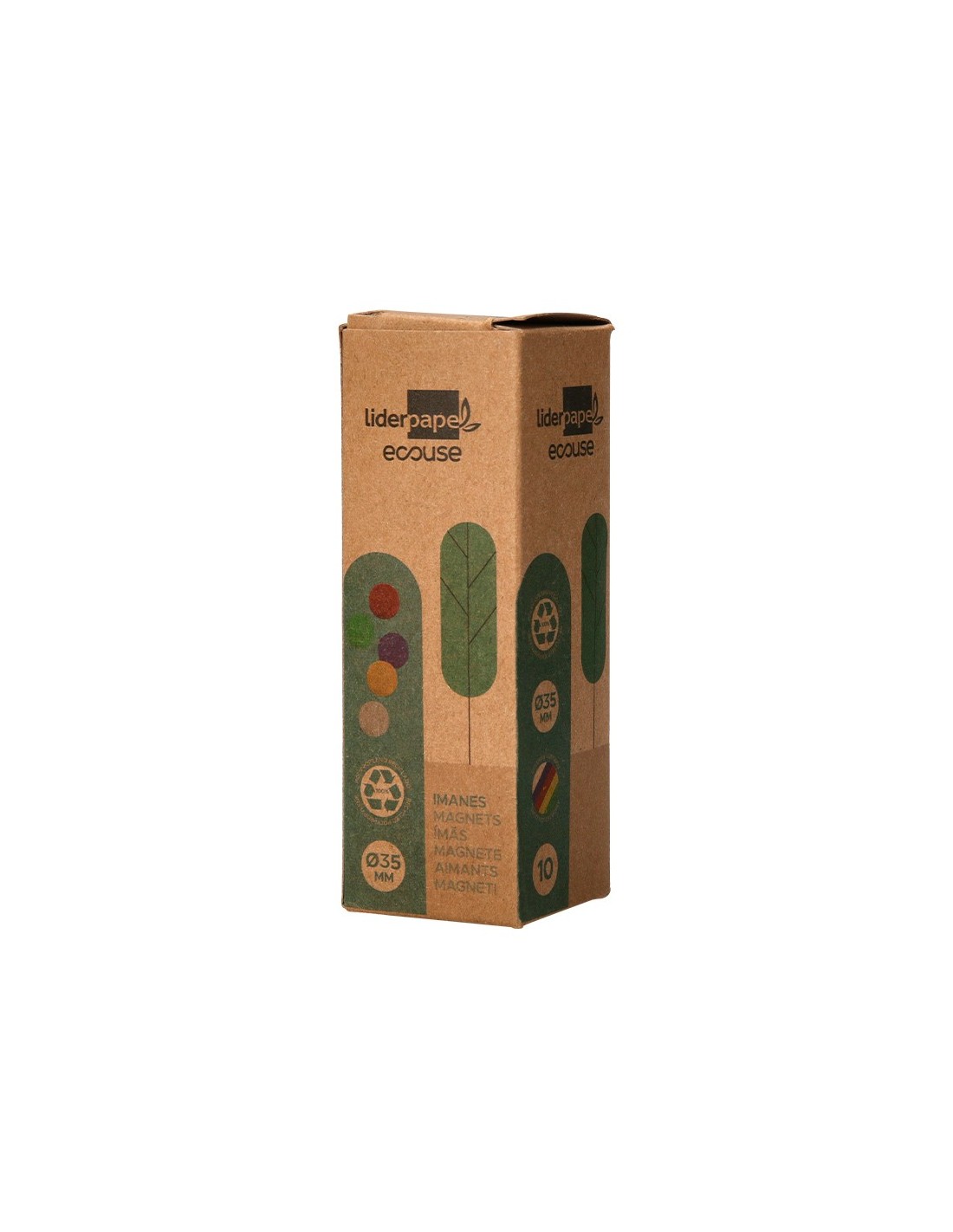 Ideales para pizarras magnéticas. Producto respetuoso con el medioambiente. Fabricado en polipropileno 100% reciclado. La caja de 10 unidades. Diámetro de 35mm.