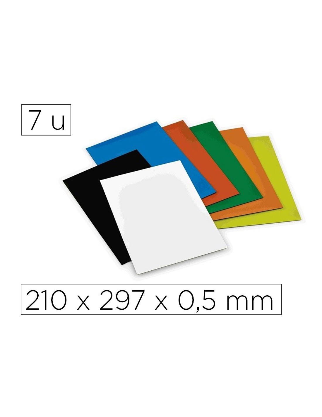 Conjunto de 7 láminas imantadas recortables en color blanco, rojo, verde, amarillo, azul, naranja y negro. Medidas: 210x297x0,5 mm. Certificadas según norma EN 71. 100% Reciclable.