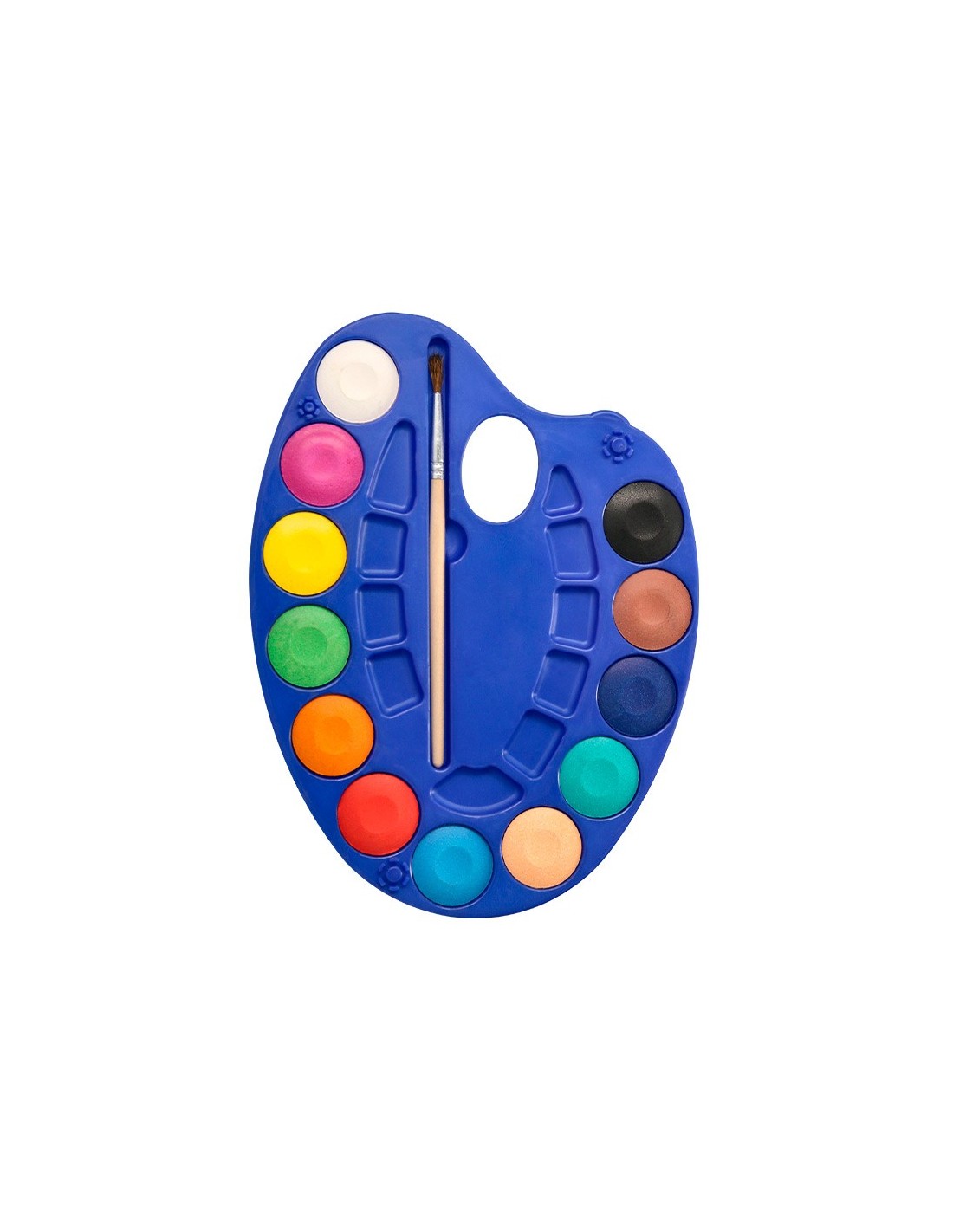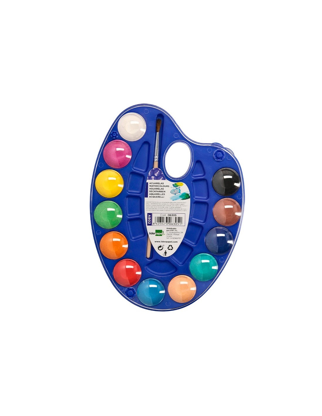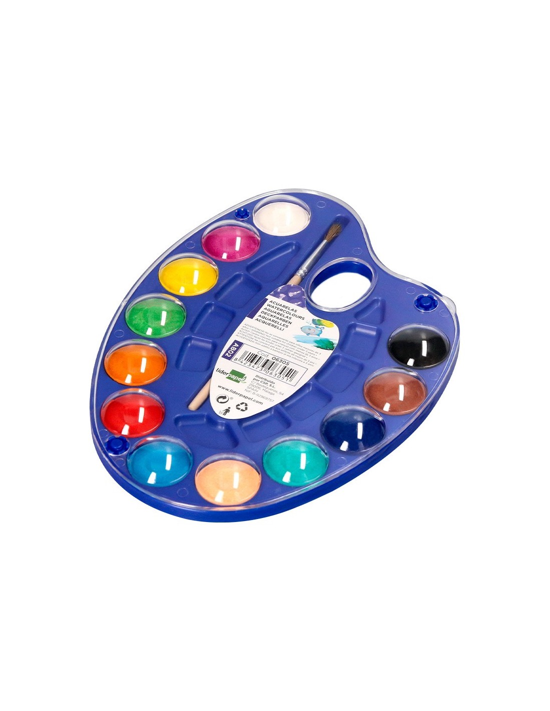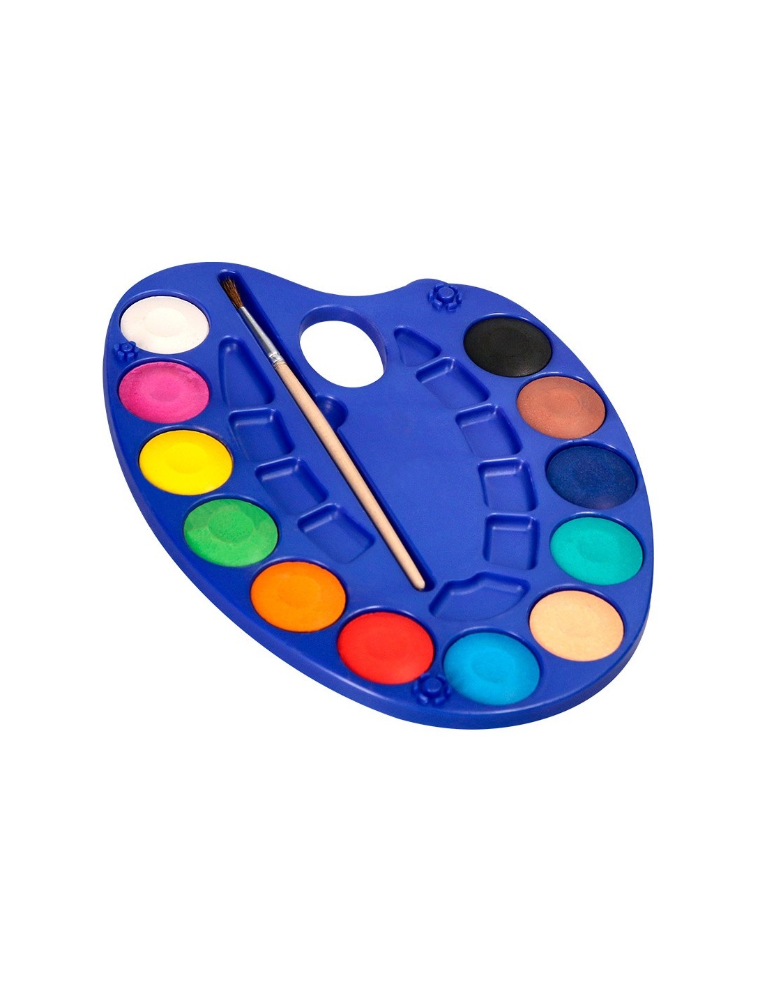 Acuarelas diluibles en agua. Paleta de plástico que incluye pincel y depósito para mezclar los colores con agua. Perfecto para uso escolar. 12 colores surtidos. Colores vivos y cubrientes. No mancha. La paleta de plástico de 12 colores surtidos.