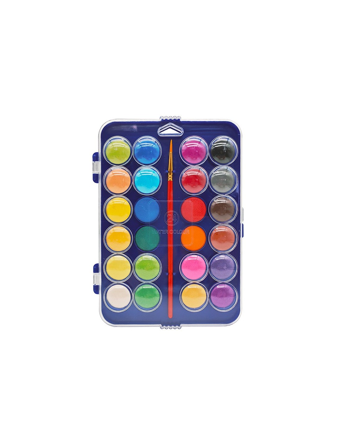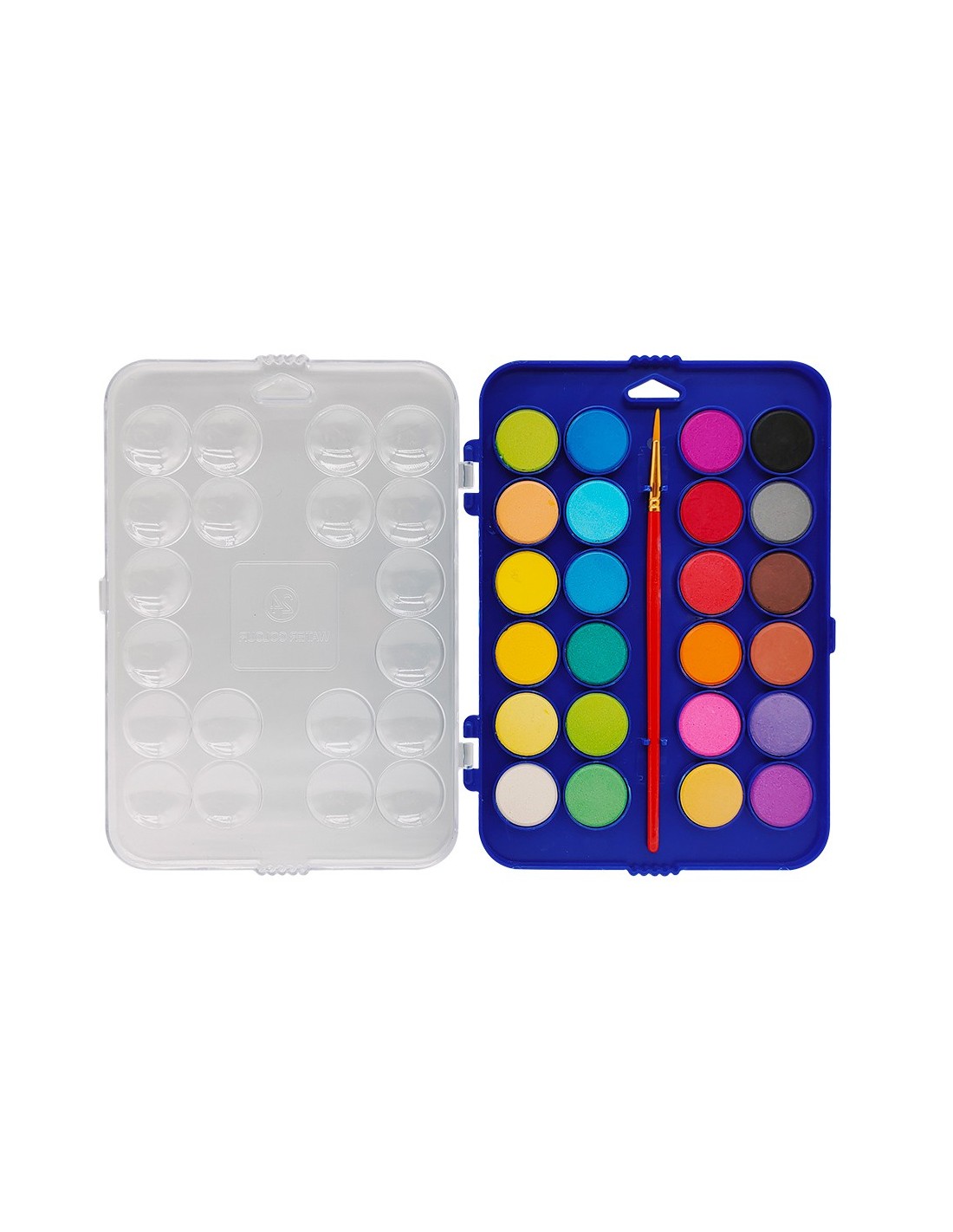 Acuarelas diluibles en agua. Incluye pincel. Perfecto para uso escolar. 24 colores surtidos. Colores vivos y cubrientes. No mancha. Estuche de plástico.