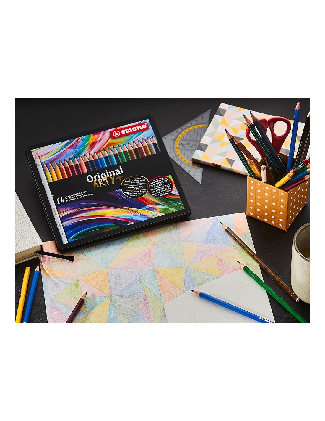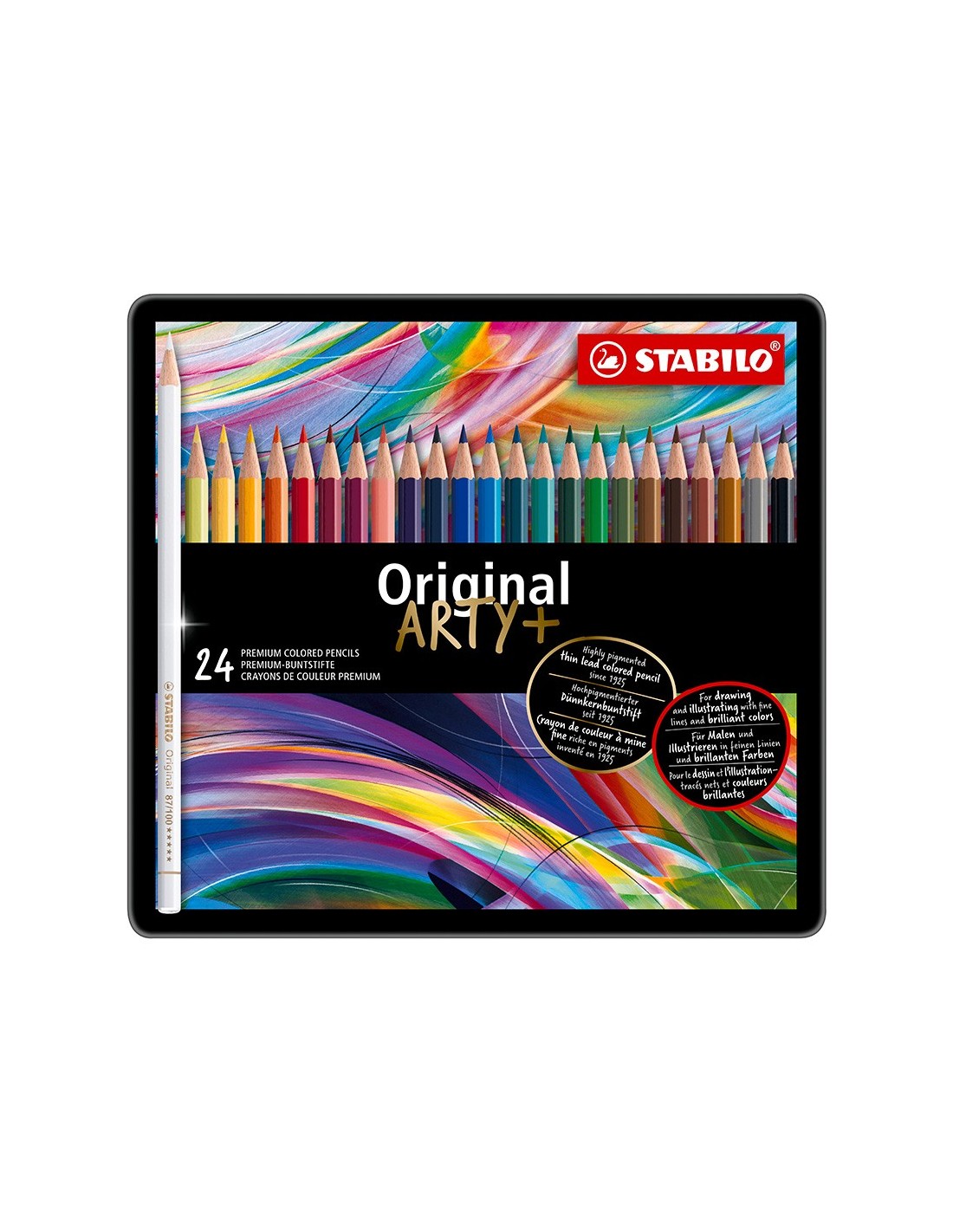 Estuche de metal Arty + con 24 lápices de color para dibujo de precisión StabiloOriginal. Mina fina y muy elástica extremadamente resistente al mismo tiempo. Para líneas finas y limpias. Convertible en acuarela parcialmente: los conternos siguen siendo visibles. Alta resistencia a la luz y brillo. Apto para fotocopiar. Diámetro de mina 2,5 mm.