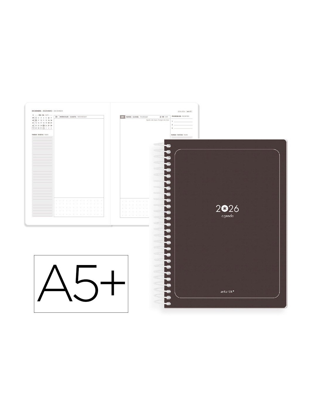 Este 2026 cambia el chip con las nuevas agendas de oficina de Antartik. Las agendas Antartik son mucho más que simples planificadores: son un manifiesto de que tu personalidad y estilo, diseñadas para almas jóvenes y creativas. Dejate envolver por la energía Antartik y descubre sus distintas COLECCION es y sus combinaciones de colores. La COLECCION ESSENTIALS está disponible en formato DIA PAGINA, en un A5+ para que tengas espacio suficiente para detallar tus tareas. Su encuadernación en espiral, a juego con el diseño, la hace funcional además de estética. ¡Descubre toda la gama de agendas Antartik y escoge la que hable por ti!El interior incluye: Calenario bianual, Planning anual, Resumen del año, Festivos en España y Portugal, Objetivos mensuales y planning mensual al inicio de cada mes, Espacio para tareas diarias y prioridades, Sección de resumen del mes al final de cada mes. CARACTERISTICAS: AGENDA ESPIRAL ANTARTIK AÑO 2026, DIA PAGINA, A5+, POLIPROPILENO, FLEXIBLE, PAPEL 80G