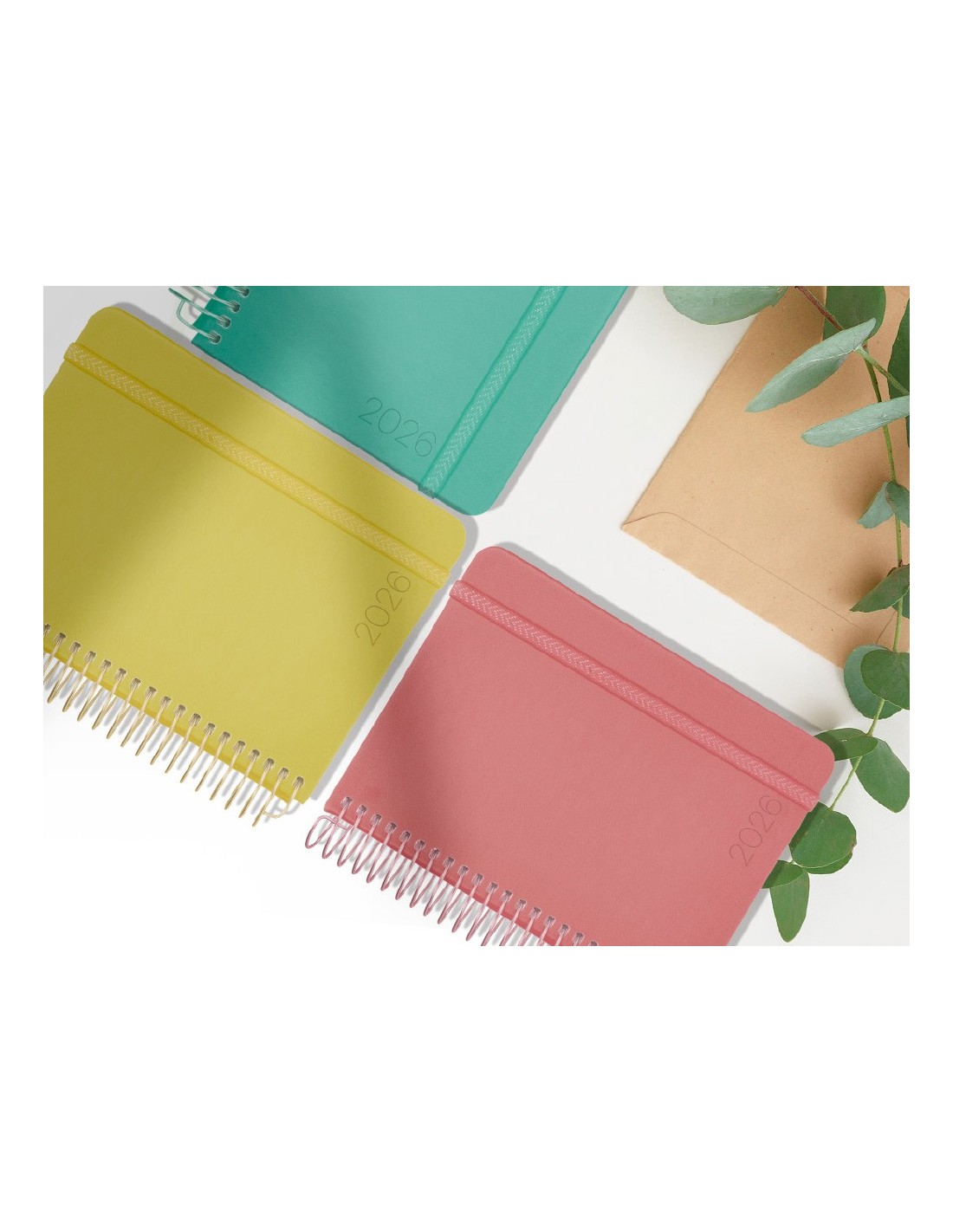 Dejate llevar por la energía de la agendas de oficina 2026 Liderpapel Neon. Esta COLECCION tiene un estilo juvenil, con colores vivos en tonos rosa, verde y amarillo. La tapa de SIMIL PIEL le añade y su encuadernacion garantizan la durabilidad del producto. Con su formato de DIA PAGINA y una banda elástica para mantener todo en su lugar, la COLECCION Neon es la compañera perfecta para mantenerse organizado este año. El interior incluye: Calendario trienio, Planning Anual, Santoral, Feriados de España y Portugal, Distancias kilométricas entre ciudades europeas, Mapas de usos horarios, Contactos. Sabado y Domingo en diferente página. CARACTERISTICAS: AGENDA ESPIRAL LIDERPAPEL AÑO 2026, DIA PAGINA, A5, SIMIL PIEL, RIGIDA, PAPEL 70G FSC, COLECCION NEON