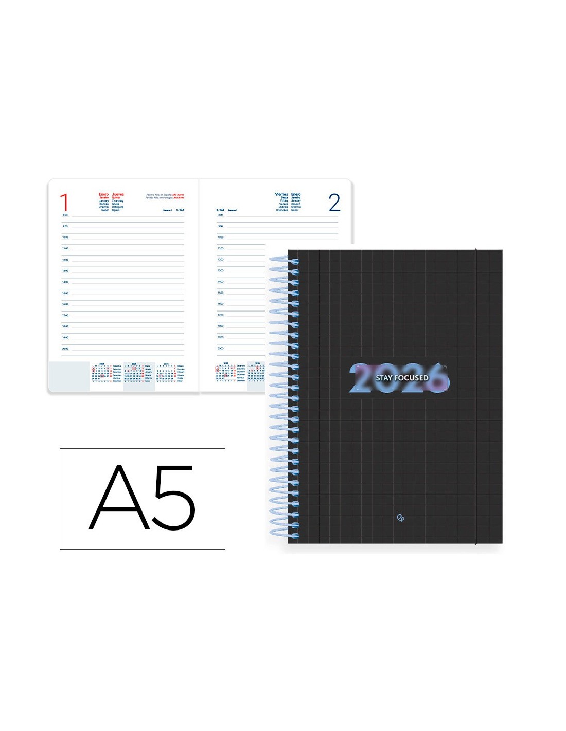 Mantente concentrado este nuevo año con las agendas Liderpapel Kimolos 2026. Con un diseño elegante y motivador, la portada incluye el  mensaje STAY FOCUS. Este diseño no solo es visualmente atractivo, sino que también inspira concentración y determinación, convirtiéndola en la herramienta perfecta para quienes buscan mantenerse enfocados y organizados en su DIA a DIA. El interior incluye: Calendario trienio, Planning Anual, Santoral, Feriados de España y Portugal, Distancias kilométricas entre ciudades europeas, Mapas de usos horarios, Contactos. Sabado y Domingo en diferente página. CARACTERISTICAS: AGENDA ESPIRAL LIDERPAPEL AÑO 2026, DIA PAGINA, A5, CARTON FORRADO, RIGIDA, ACABADO SOFT TOUCH  Y AÑO EN CABADO IRIDISCENTE BRILLANTE, PAPEL 70G FSC, COLECCION KIMOLOS