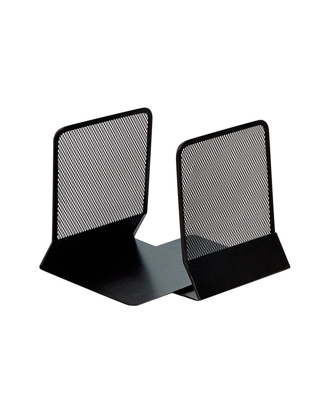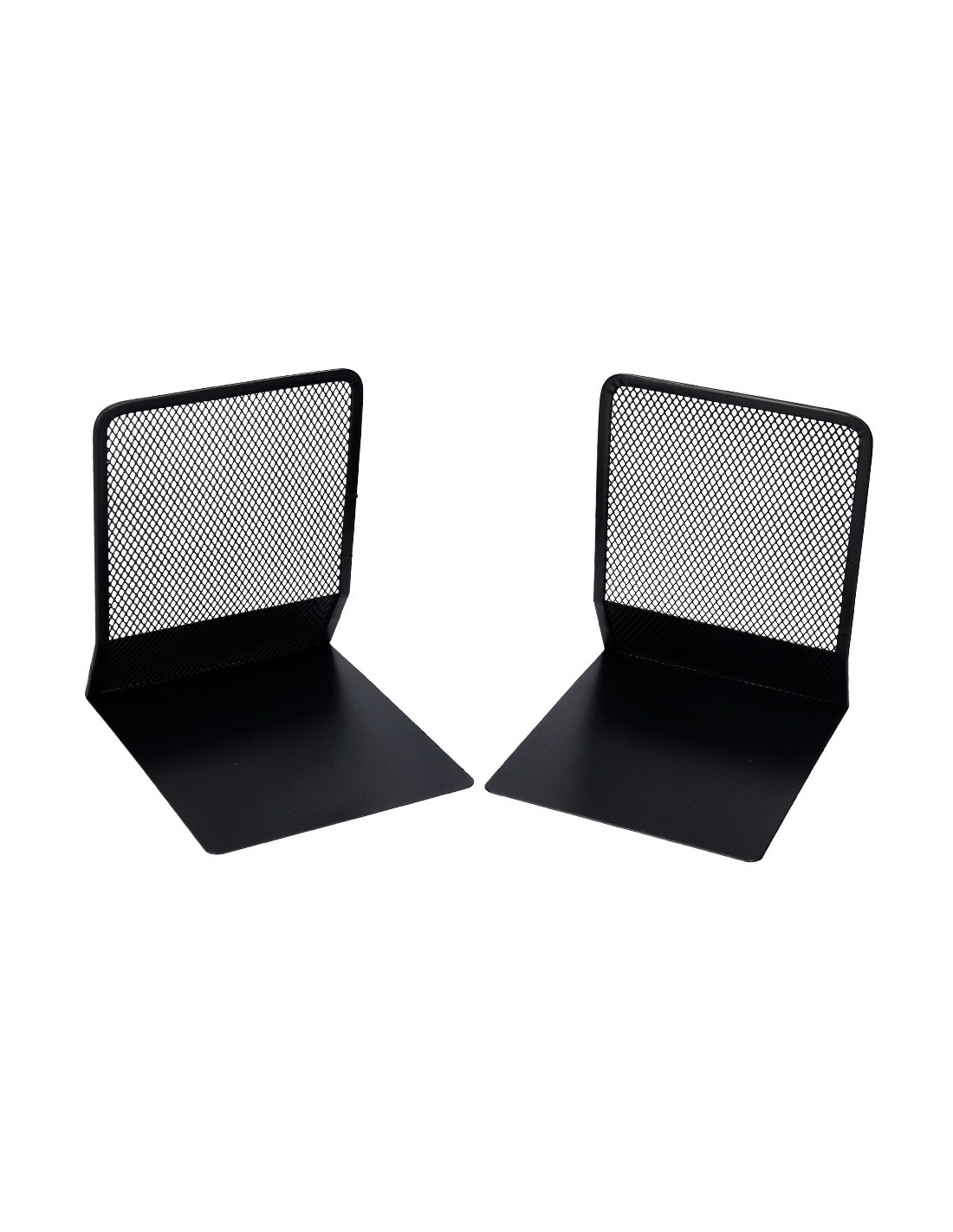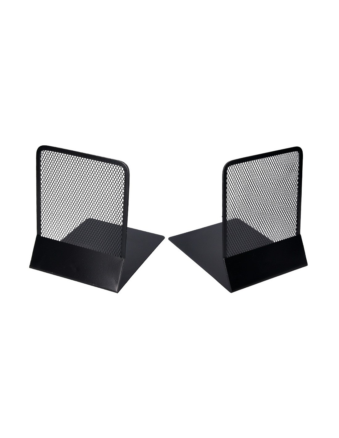 Juego de 2 apoyalibros metálicos de rejilla. Diseño atractivo y resistente. Color negro. Medidas: 165 x 152 x 135 mm.