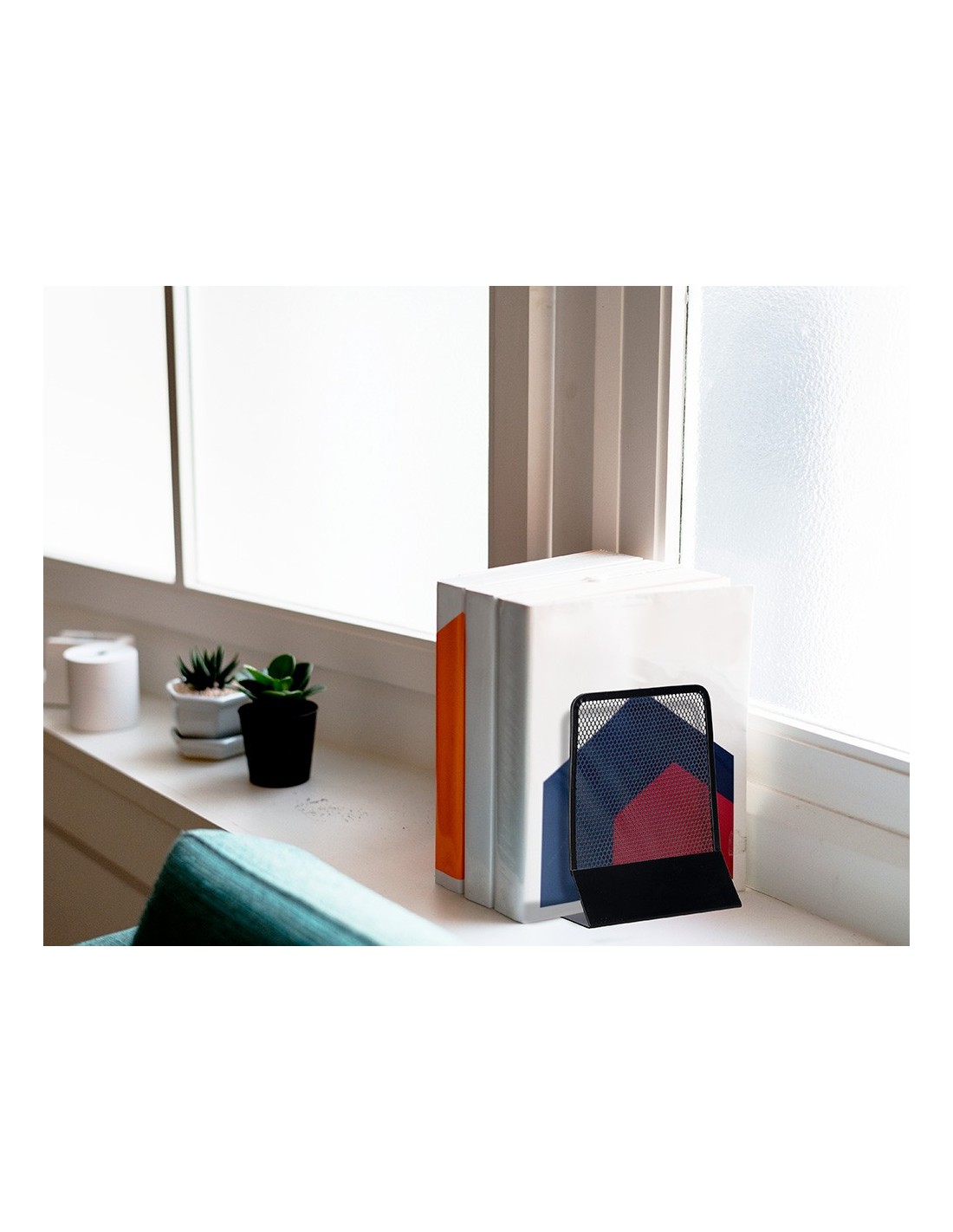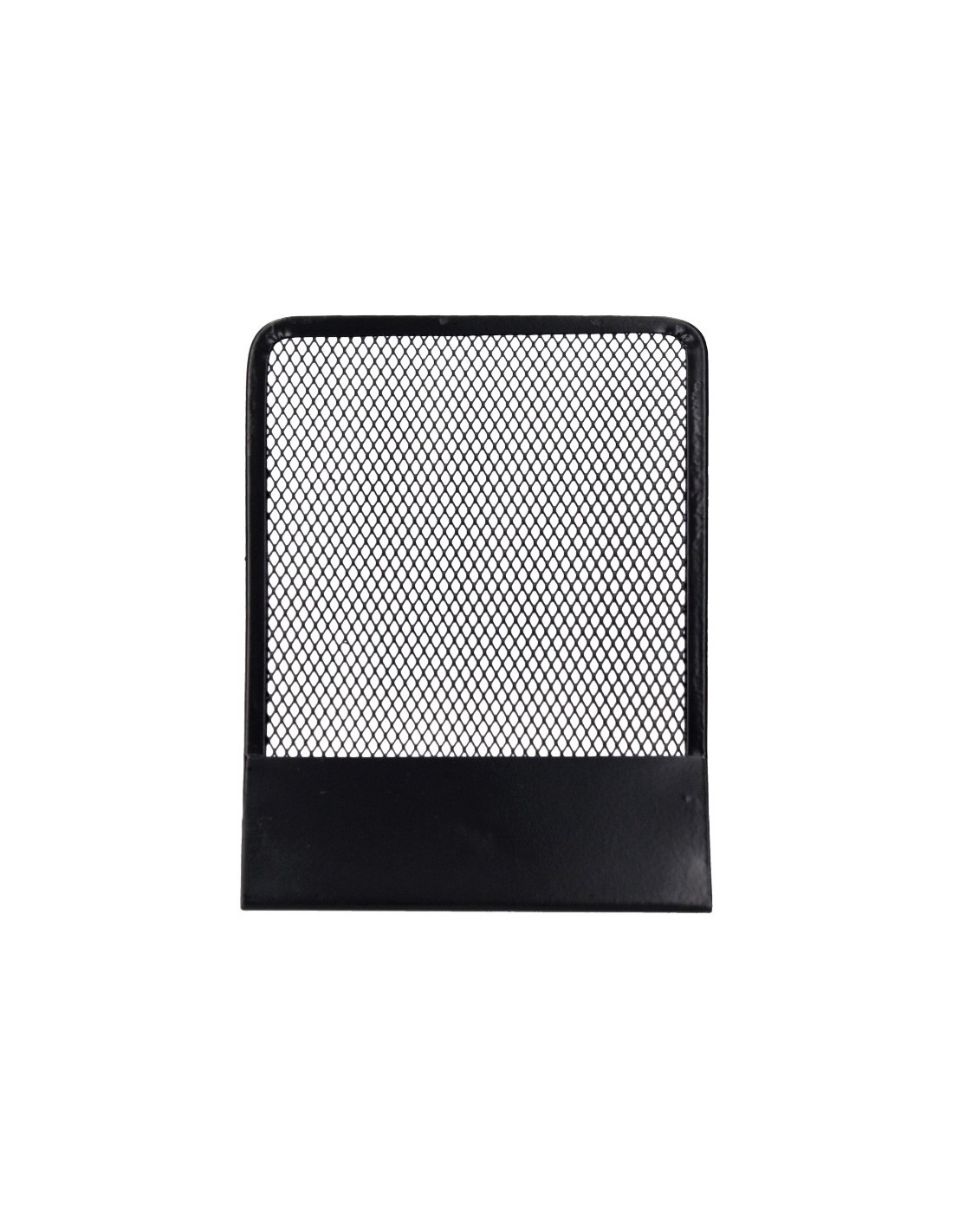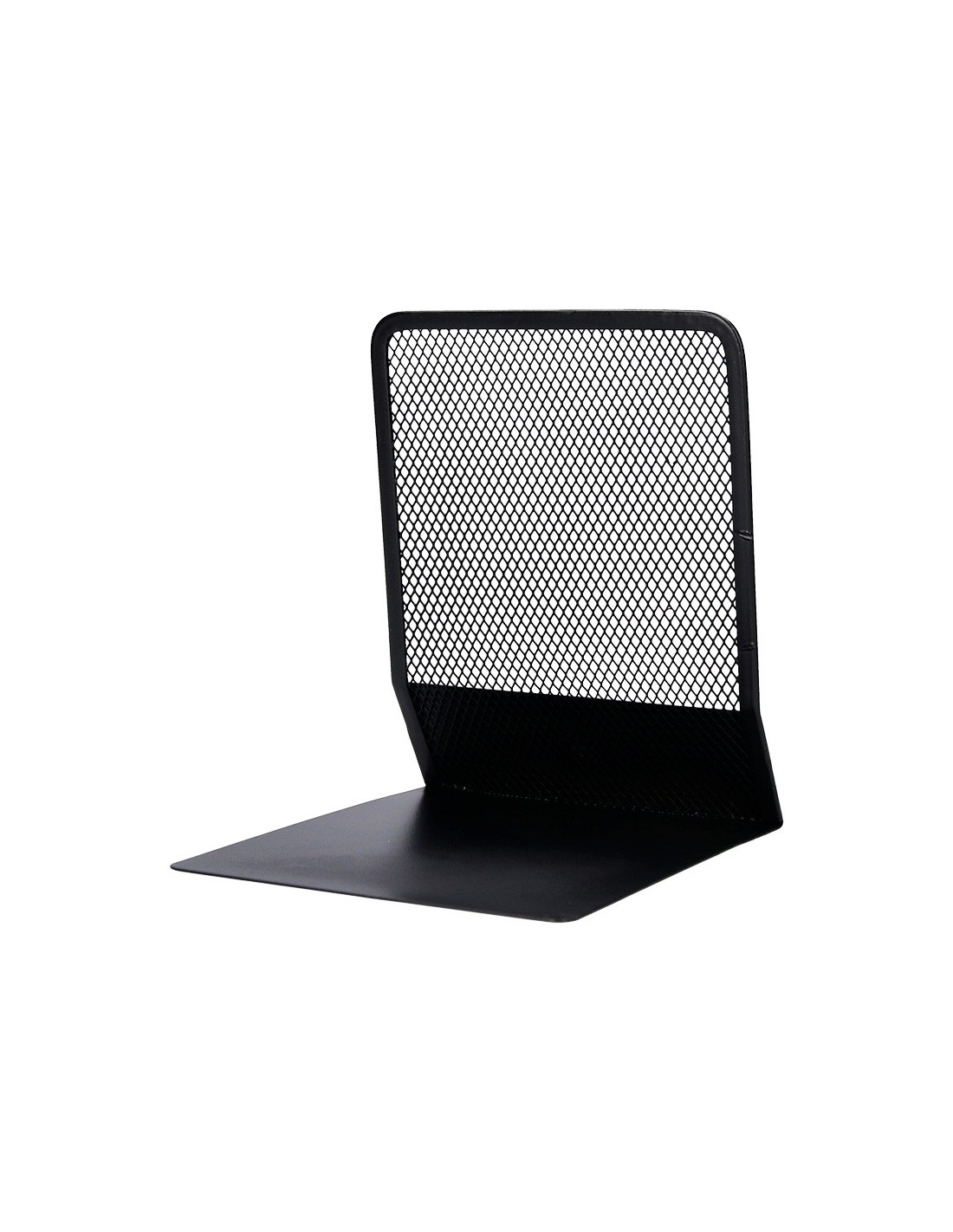 Juego de 2 apoyalibros metálicos de rejilla. Diseño atractivo y resistente. Color negro. Medidas: 165 x 152 x 135 mm.