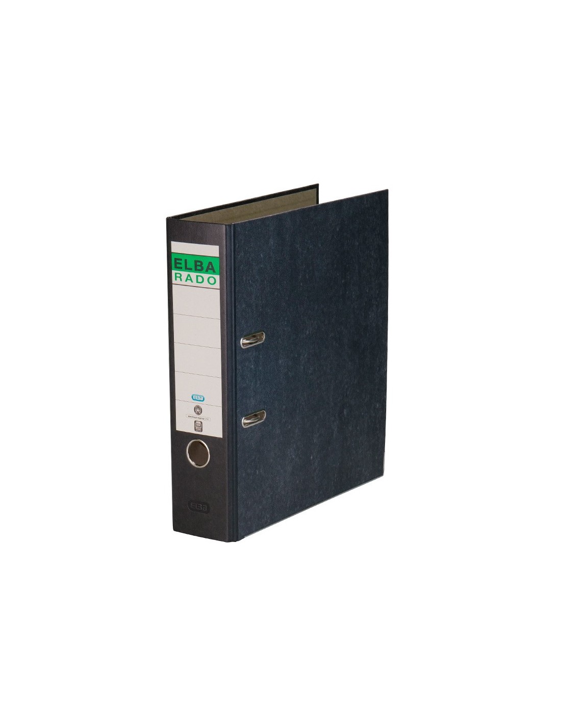 Archivador de palanca clásico 2 anillas. Con lomo ancho y Rado®. Jaspeado. Fabricado en cartón extrarrígido con ollao, cantoneras metálicas, etiqueta adhesiva y encarte índice. Lomo de 80 mm. Color negro.