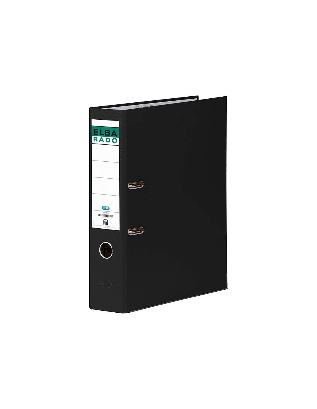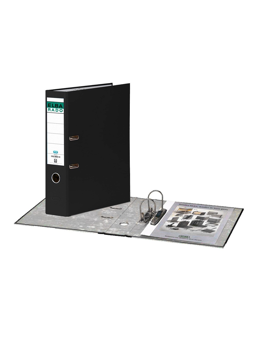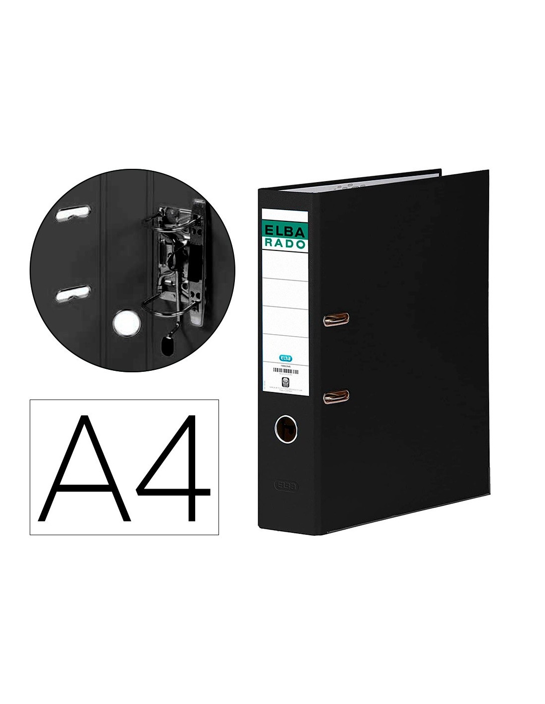 Archivador forrado en plástico de gran resistencia. Etiqueta fija en el lomo, 2 anillas de 75 mm. Con mecanismo de palanca, compresor metálico, ollao y Rado®. Cantoneras largas.