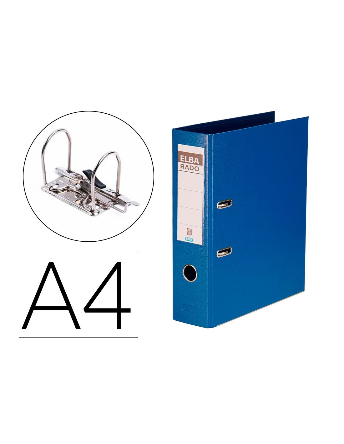 Archivador fabricado en cartón forrado con papel tratado, con anillas de 75 mm con mecanismo de palanca, cantoneras largas, ollao, Rado®, tarjetero en lomo y compresor metálico. Ancho de lomo: 80 mm. 2 anillas.