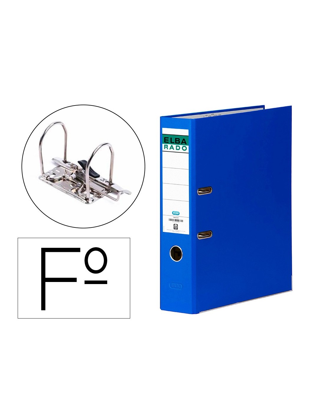 Archivador forrado en plástico de gran resistencia. Etiqueta fija en el lomo, 2 anillas de 75 mm. Con mecanismo de palanca, compresor metálico, ollao y Rado®. Cantoneras largas.