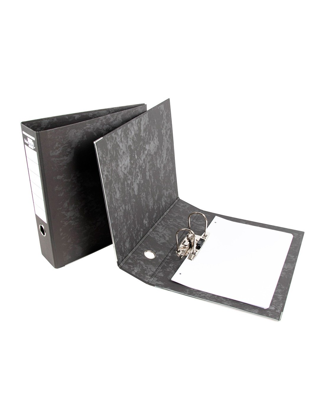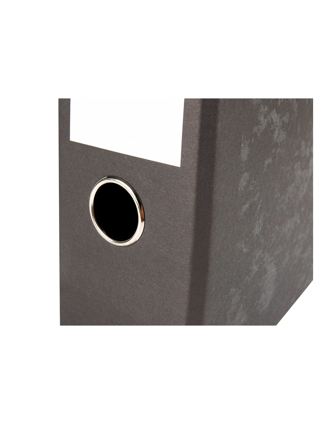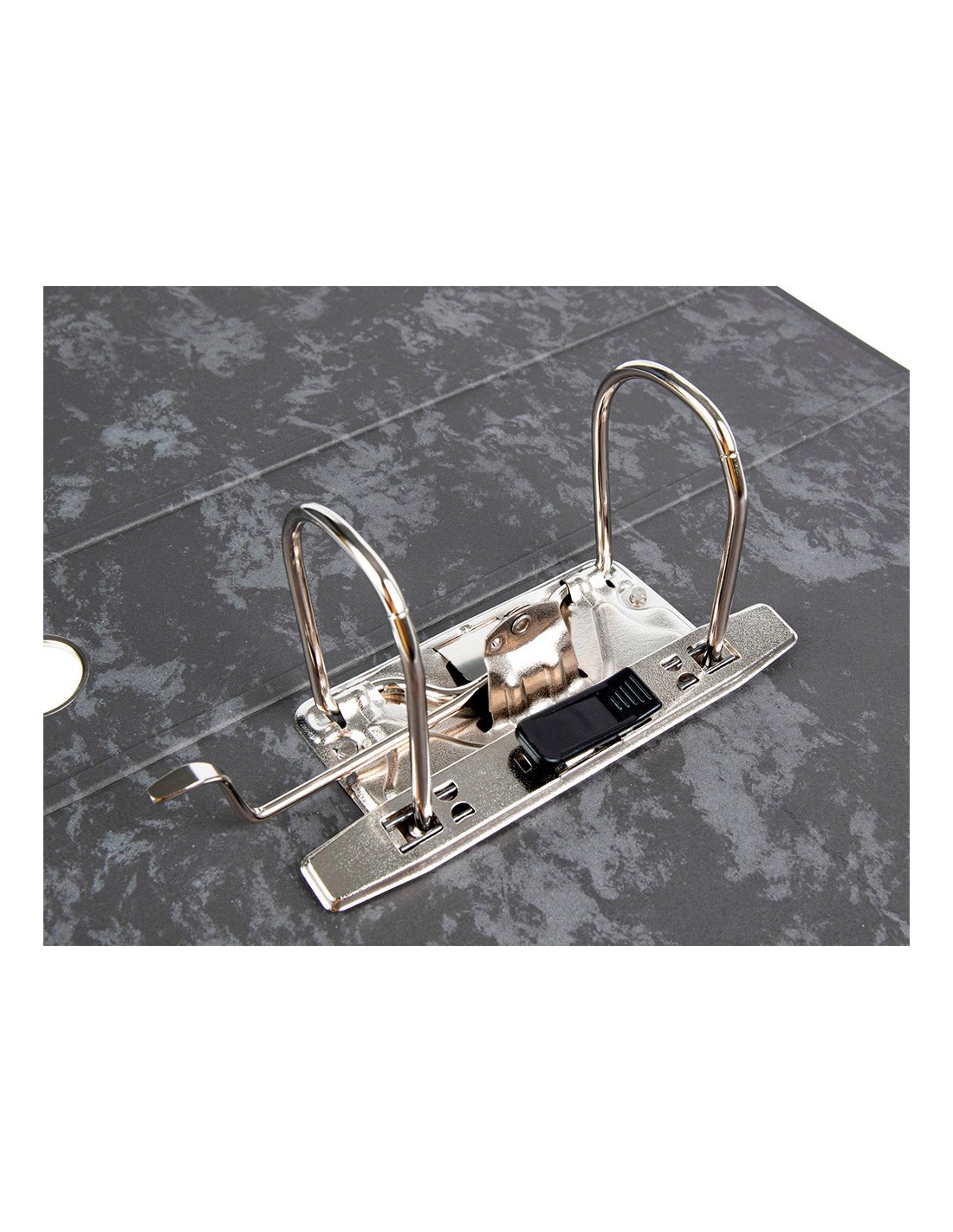 Archivador de cartón de 1,9 mm de espesor forrado. Interior y exterior jaspeado negro. Mecanismo de palanca niquelado de 75 mm. Compresor metálico, ollao y cantoneras largas. Etiqueta impresa. Sin caja. Color negro. Ancho de lomo: 80 mm.