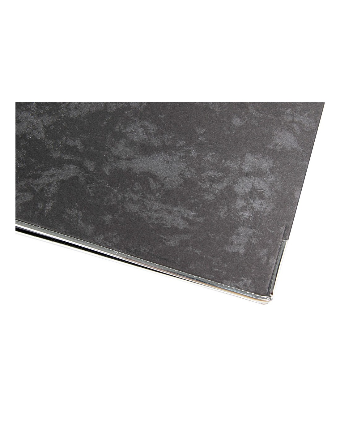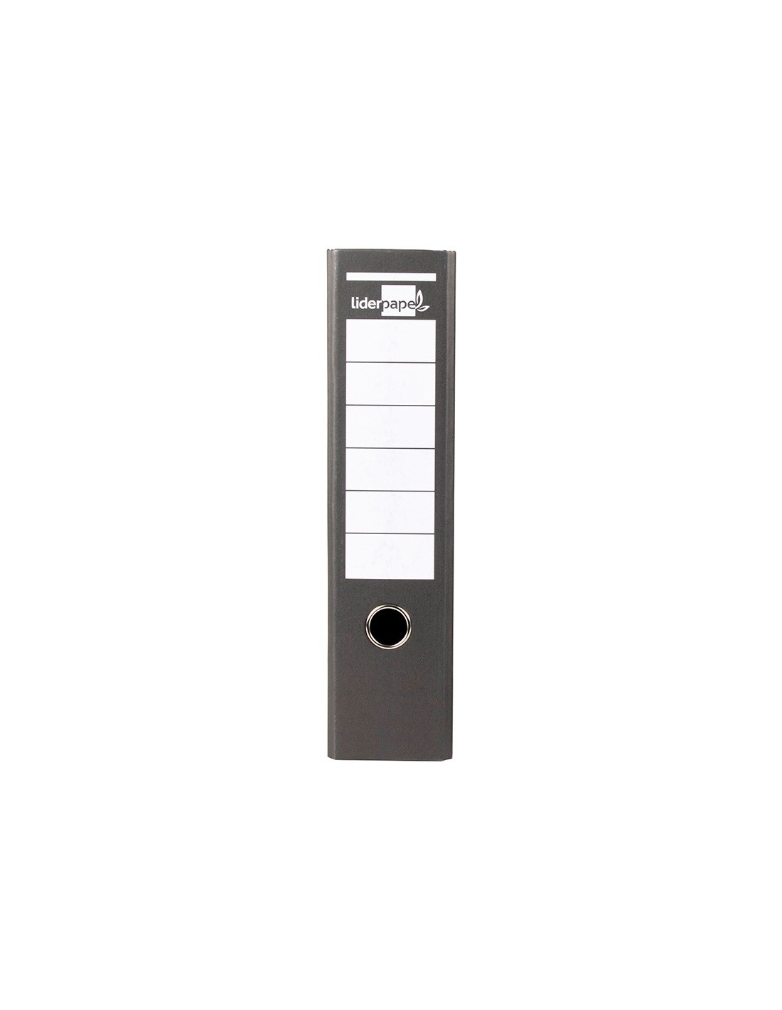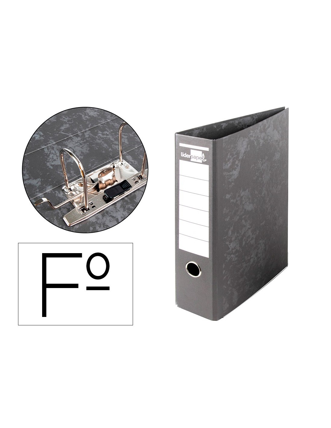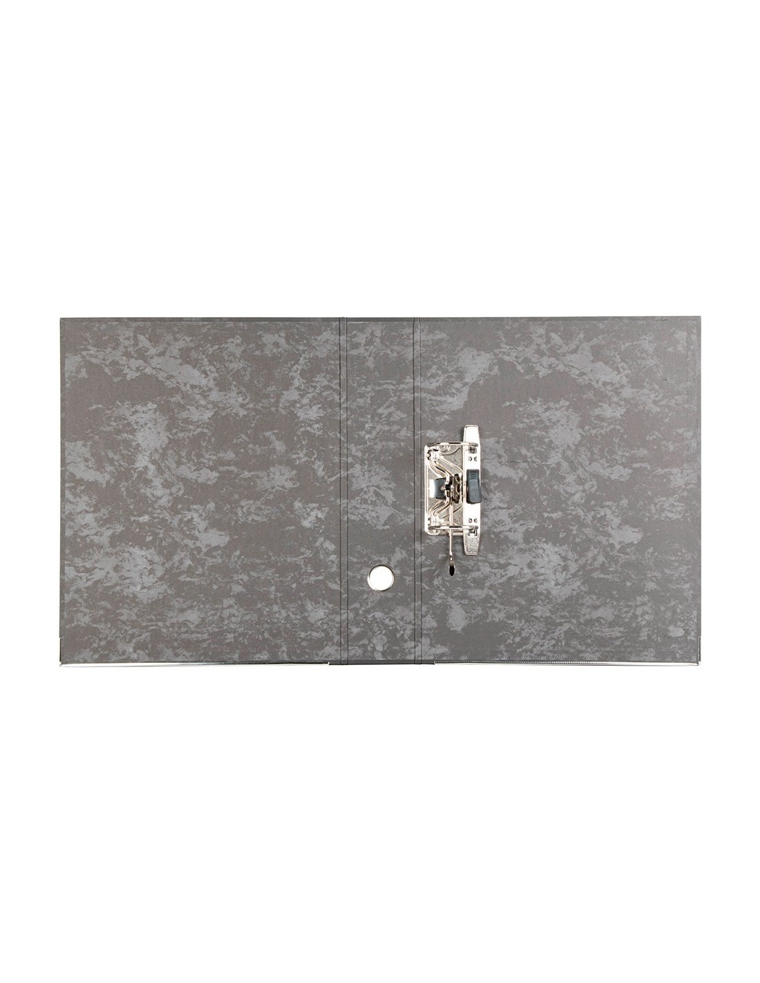 Archivador de cartón de 1,9 mm de espesor forrado. Interior y exterior jaspeado negro. Mecanismo de palanca niquelado de 75 mm. Compresor metálico, ollao y cantoneras largas. Etiqueta impresa. Sin caja. Color negro. Ancho de lomo: 80 mm.