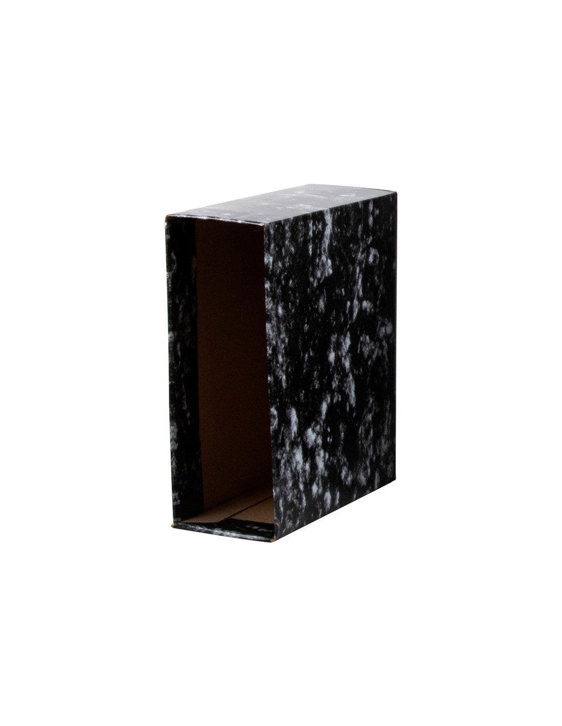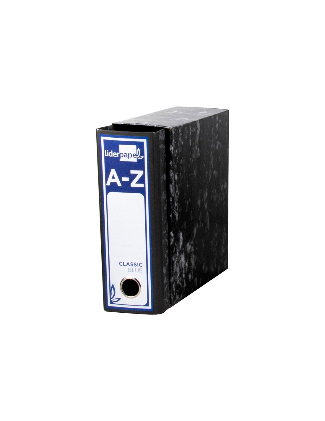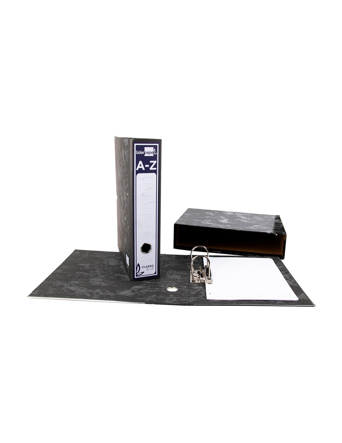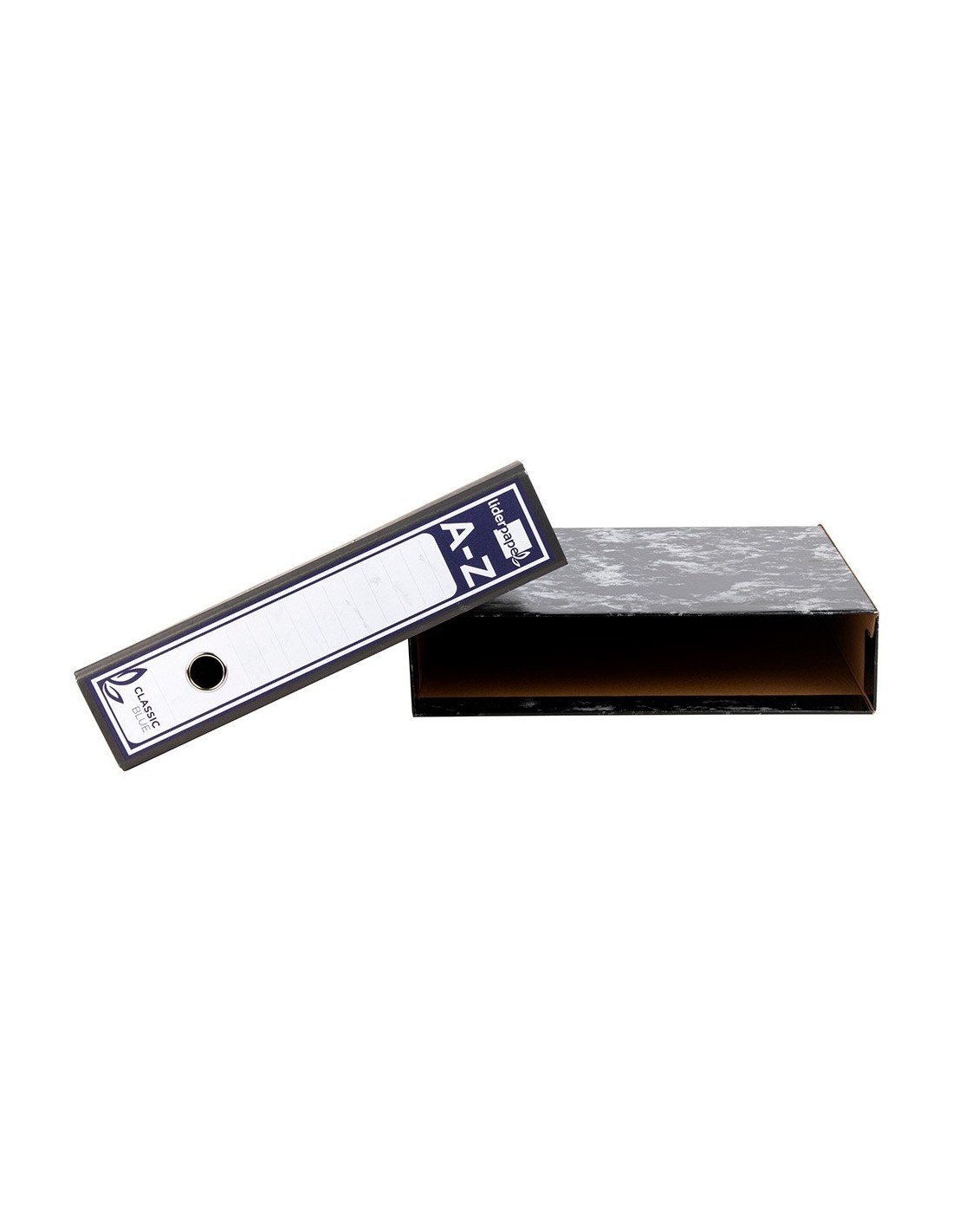 Archivador de cartón entrecolado de 1,9 mm de espesor forrado interior y exterior. Mecanismo de palanca niquelado de 75 mm, compresor metálico, ollao y cantoneras largas. Lomo ancho. Sin índice, cajetín opcional. Ancho de lomo: 80 mm.