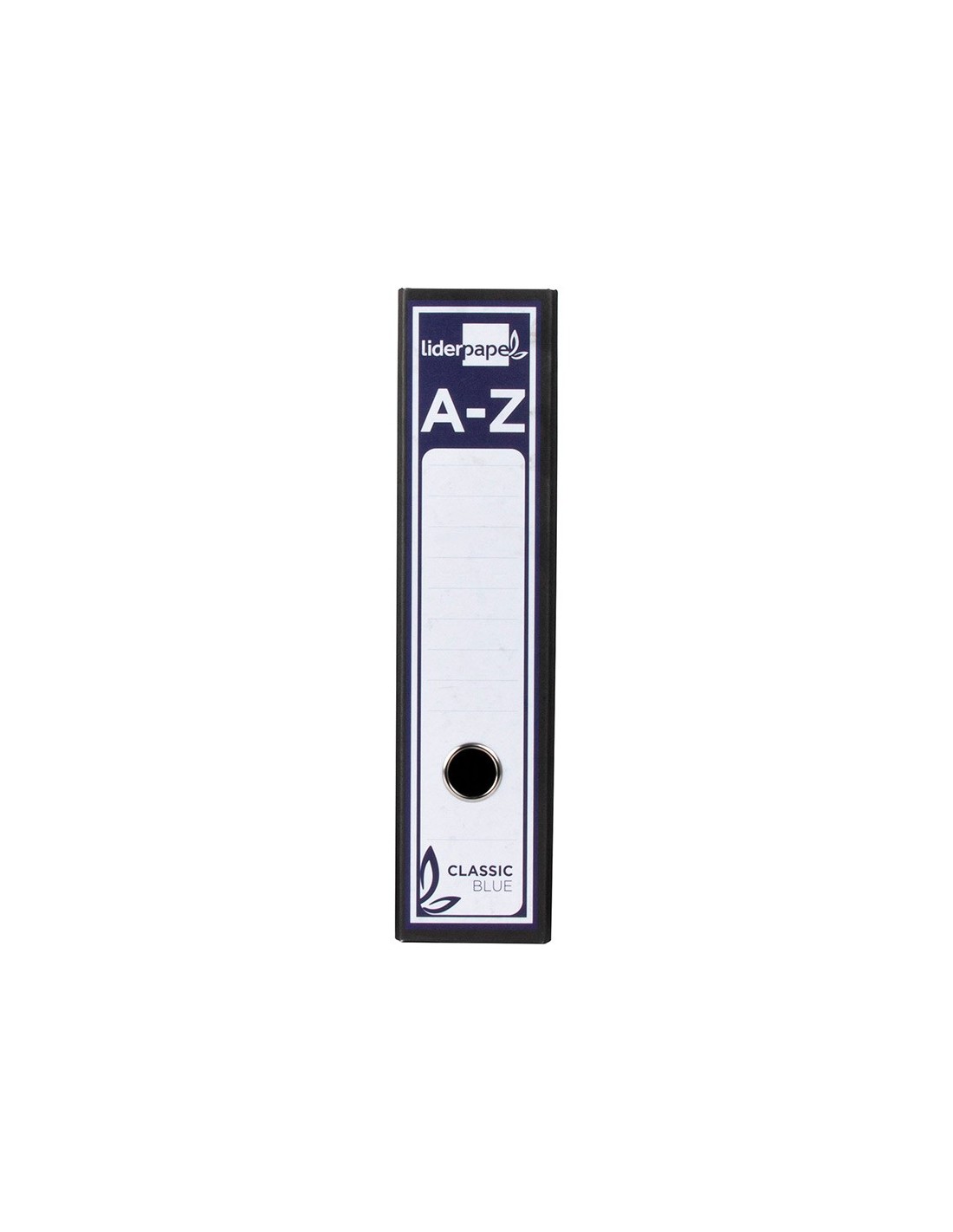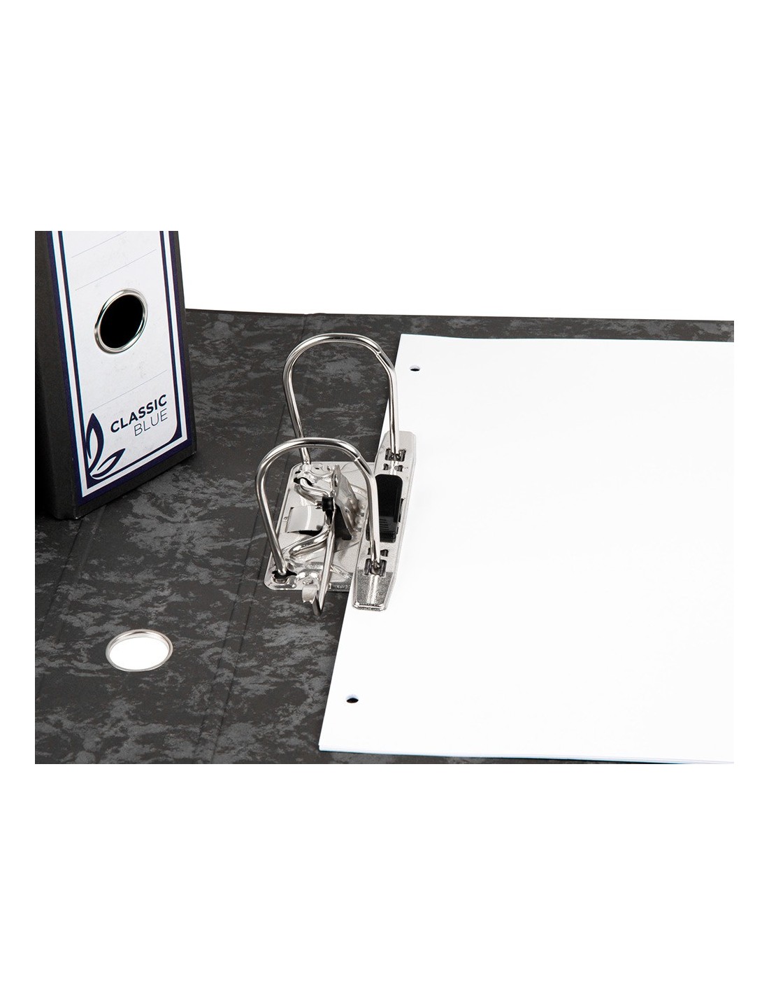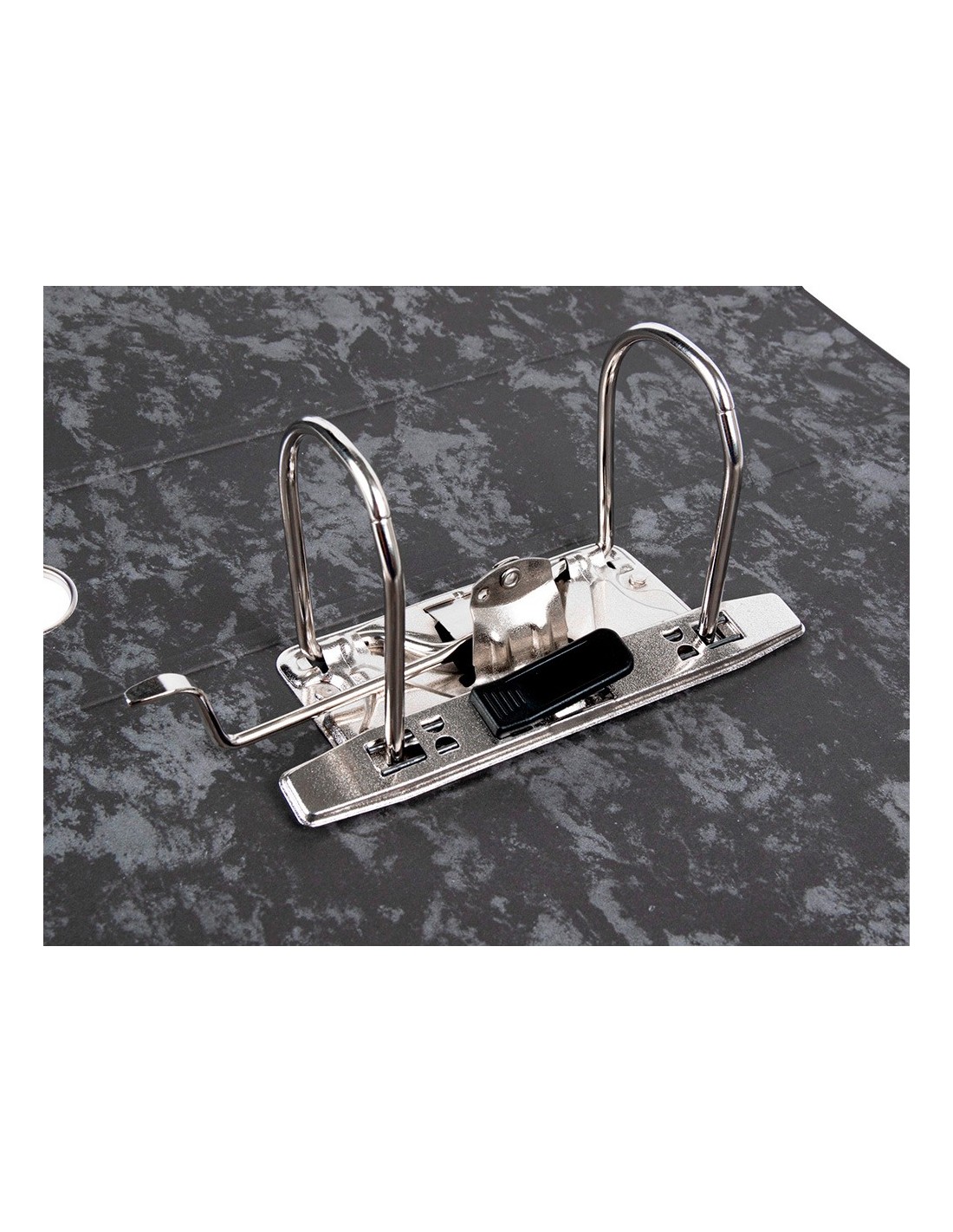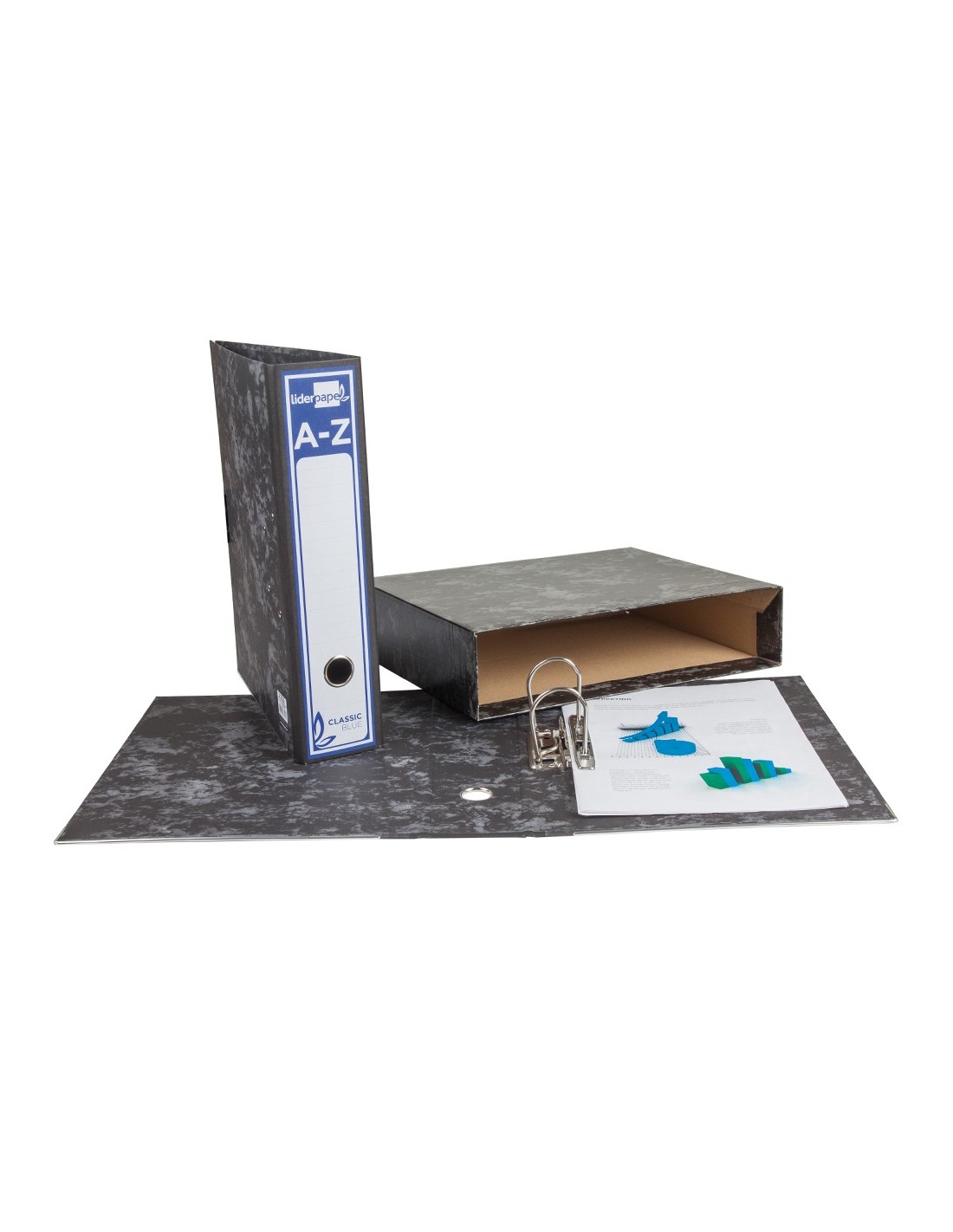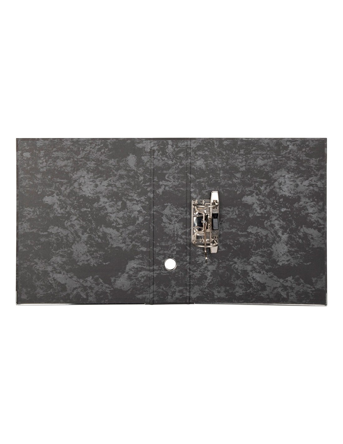 Archivador de cartón entrecolado de 1,9 mm de espesor forrado interior y exterior. Mecanismo de palanca niquelado de 75 mm, compresor metálico, ollao y cantoneras largas. Lomo ancho. Sin índice, con caja. Ancho de lomo: 80 mm. Medidas: 287 x 350 mm.