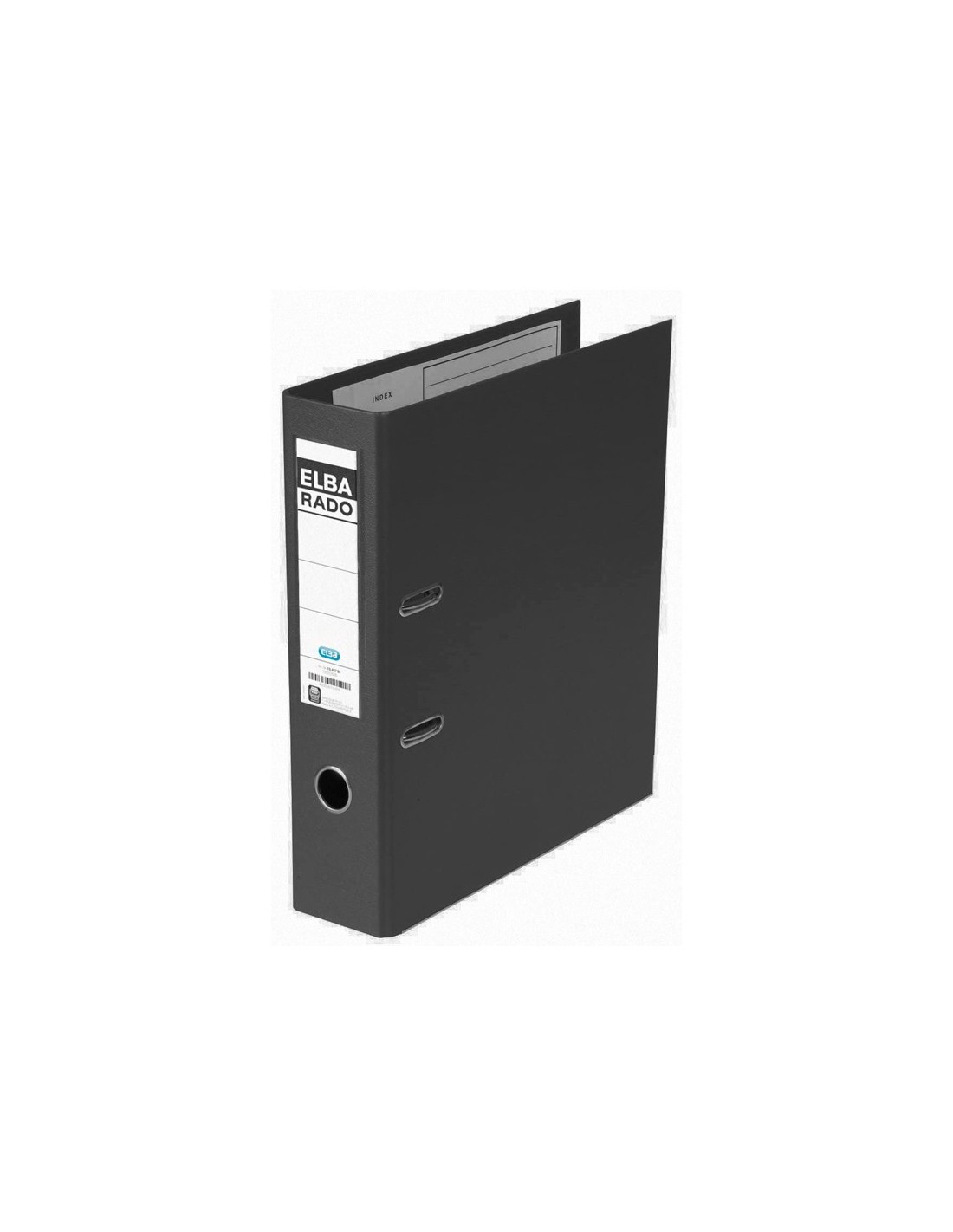 Archivador fabricado en cartón forrado con papel tratado, con anillas de 75 mm con mecanismo de palanca, cantoneras largas, ollao, Rado®, tarjetero en lomo y compresor metálico. Ancho de lomo: 80 mm. 2 anillas.