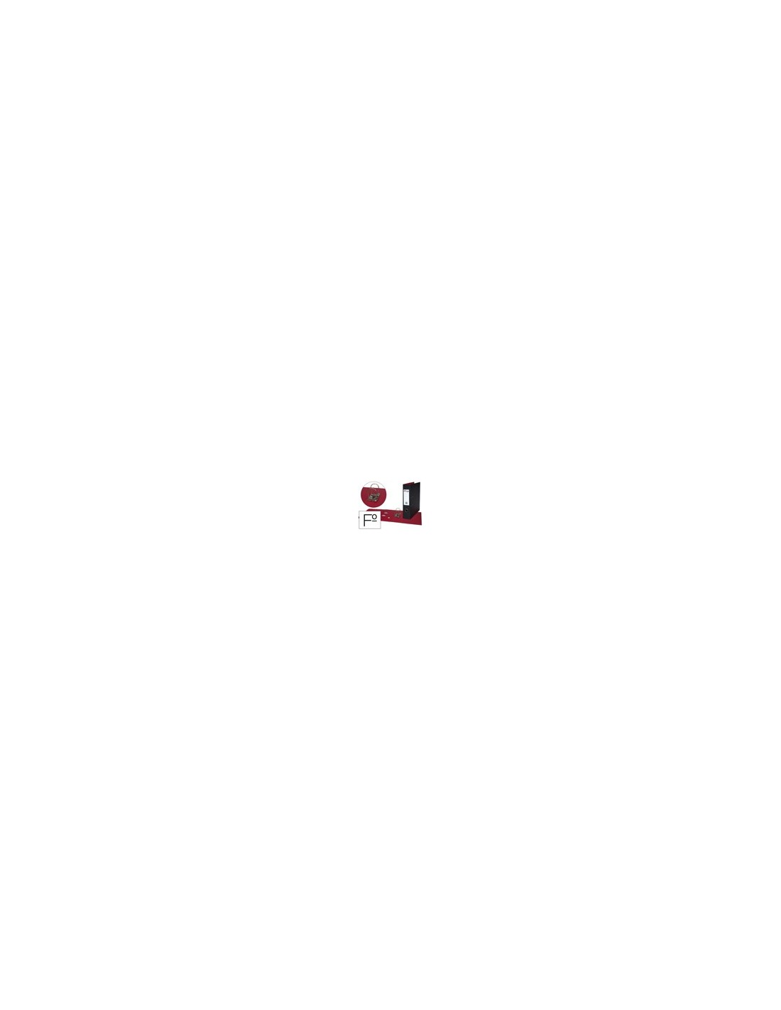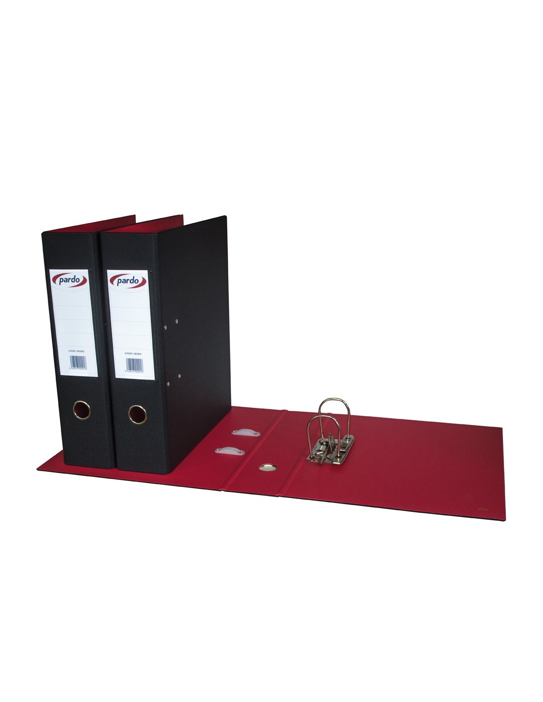 Archivador extracompacto. Cartón de 2,5 mm forrado en plástico encolado y soldado. Con mecanismo de palanca de 70 mm y compresor metálico. Ancho de lomo: 80 mm. Con ollao y tarjetero en el lomo. Tamaño folio. Medidas: 285 x 335 mm.