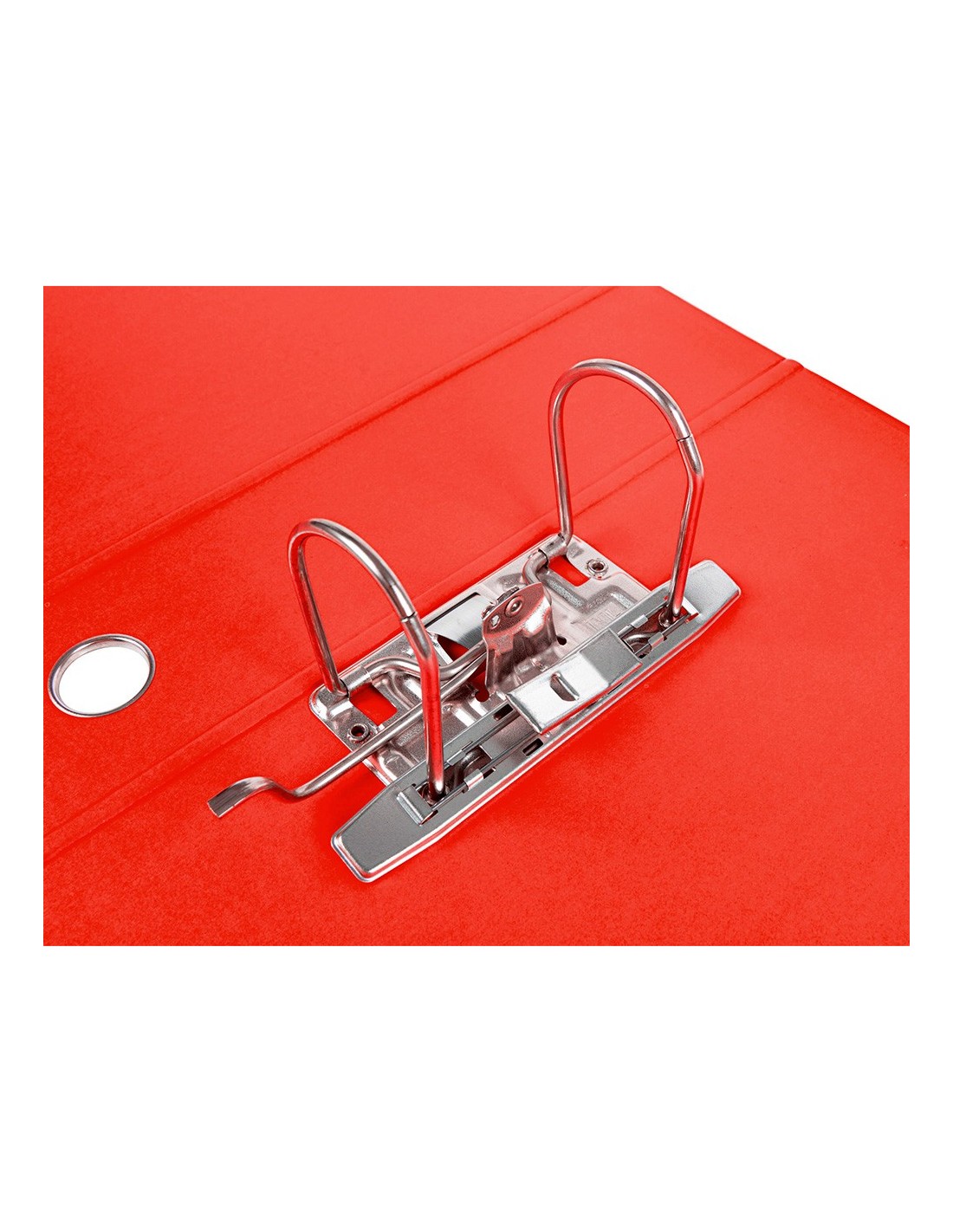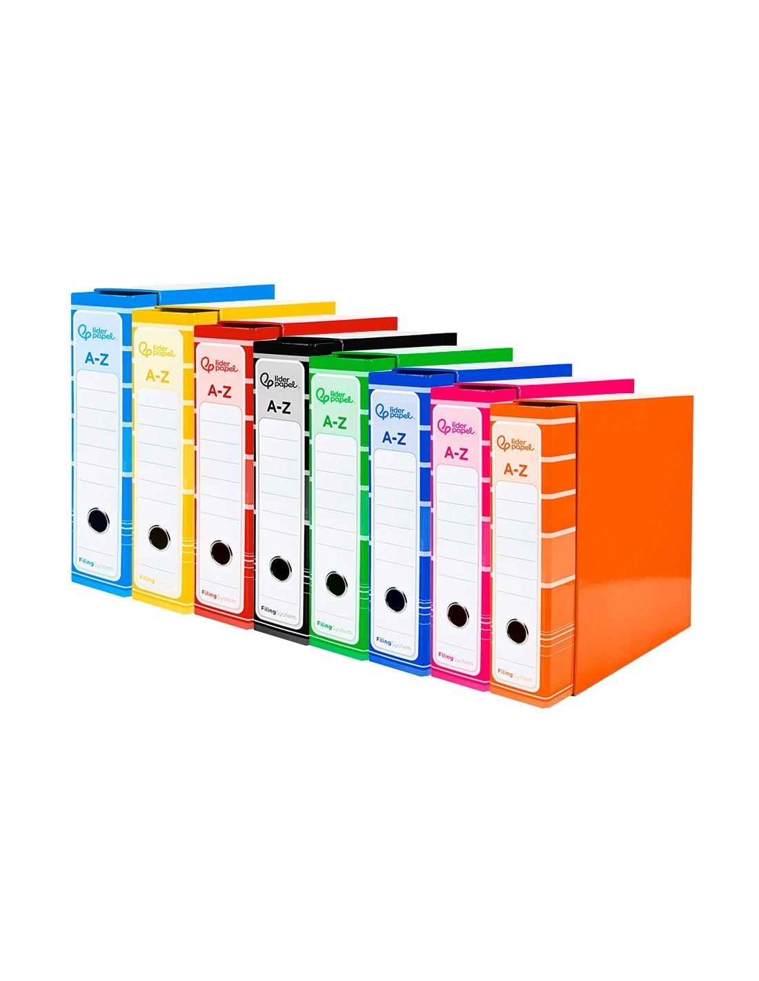 Archivador fabricado en cartón forrado de 1,9 mm de espesor, plastificado con caja. Mecanismo de palanca de 75 mm con ollao y compresor metálico. Ancho de lomo: 80 mm. Formato DIN A4. Medidas: 285 x 318 mm.