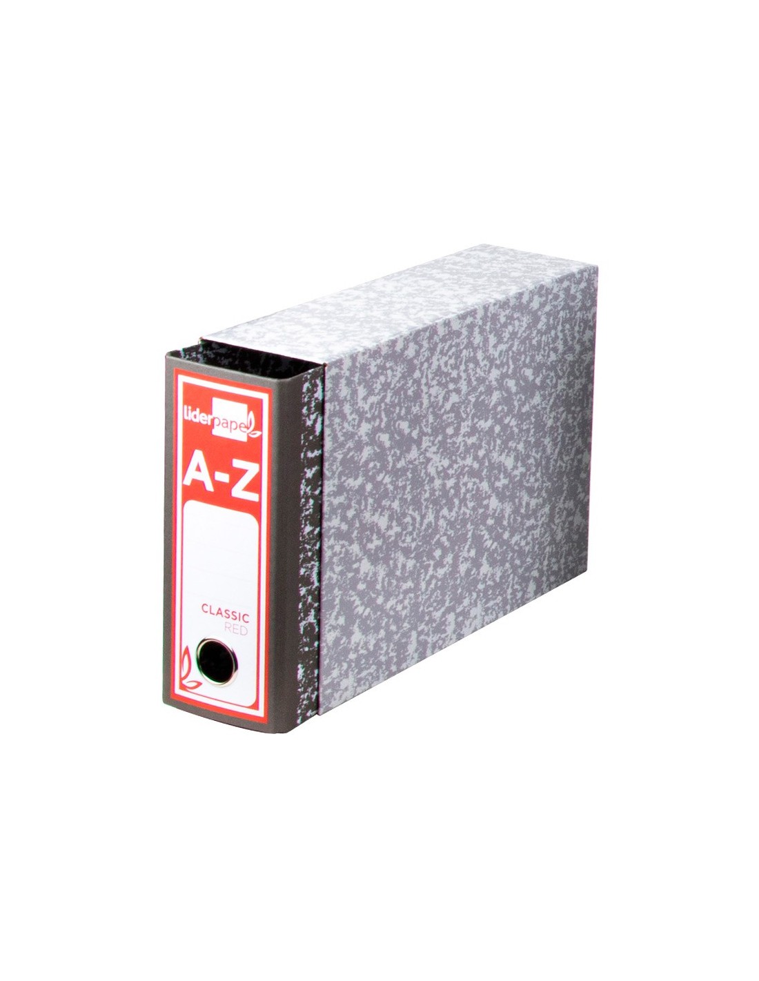 Archivador de cartón entrecolado de 1,9 mm de espesor forrado interior y exterior. Mecanismo de palanca niquelado de 75 mm, compresor metálico, ollao y cantoneras largas. Lomo ancho. Sin índice, cajetín opcional. Ancho de lomo: 80 mm.