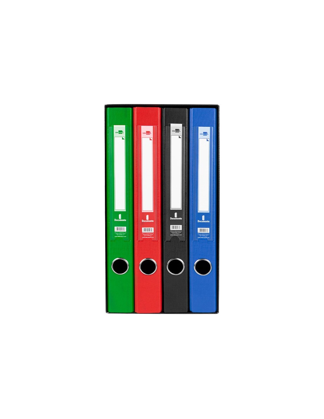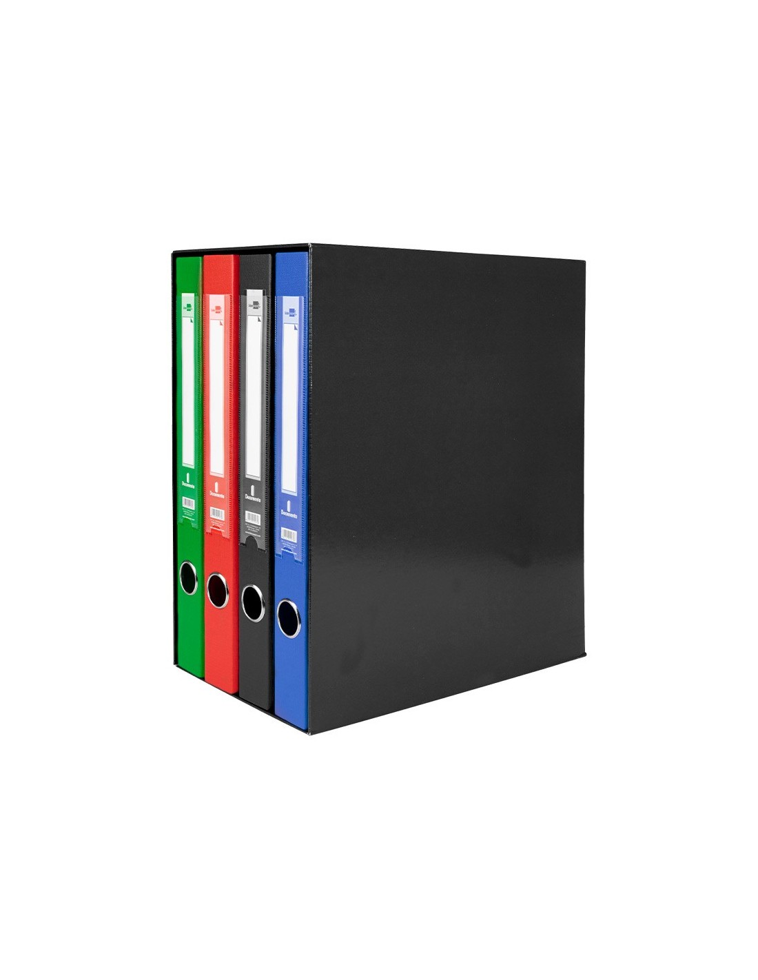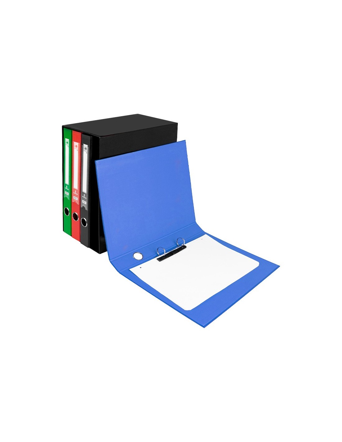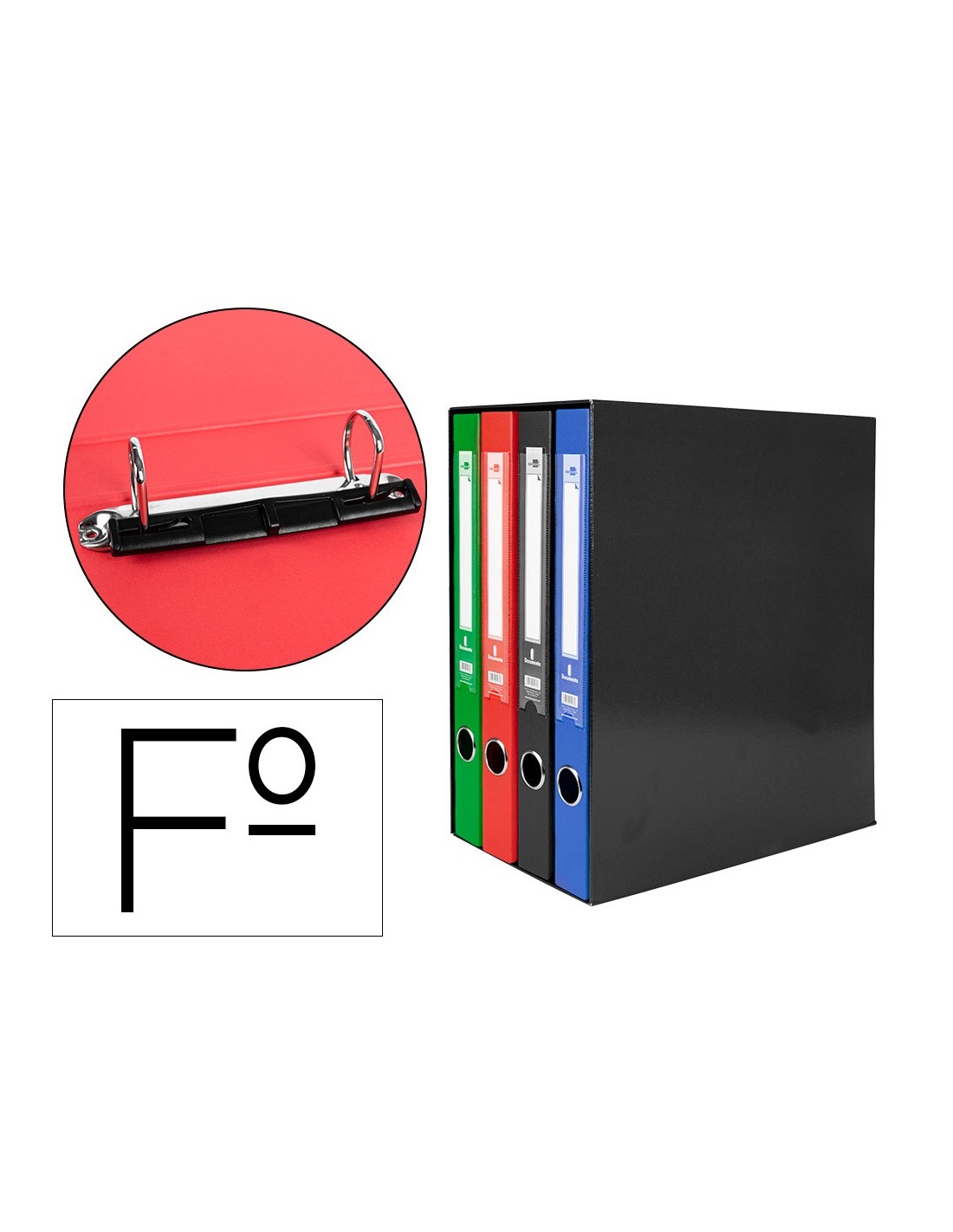 Fabricado en cartón entrecolado de 1,90 mm de espesor forrado con papel deencuadernación plastificado y gofrado con tela de PVC. 2 anillas mixtas d e 25 mm con compresor de plástico, cantoneras largas, ollao y tarjetero enel lomo. Tamaño folio. Medidas exteriores del módulo: 184 mm ancho x 350 mm alto x 290 mm fondo. Ancho de lomo: 40 mm. Colores surtidos, la forma más cómoda de tener la documentación de varios asuntos perfectamente clasificada y separada por color.
