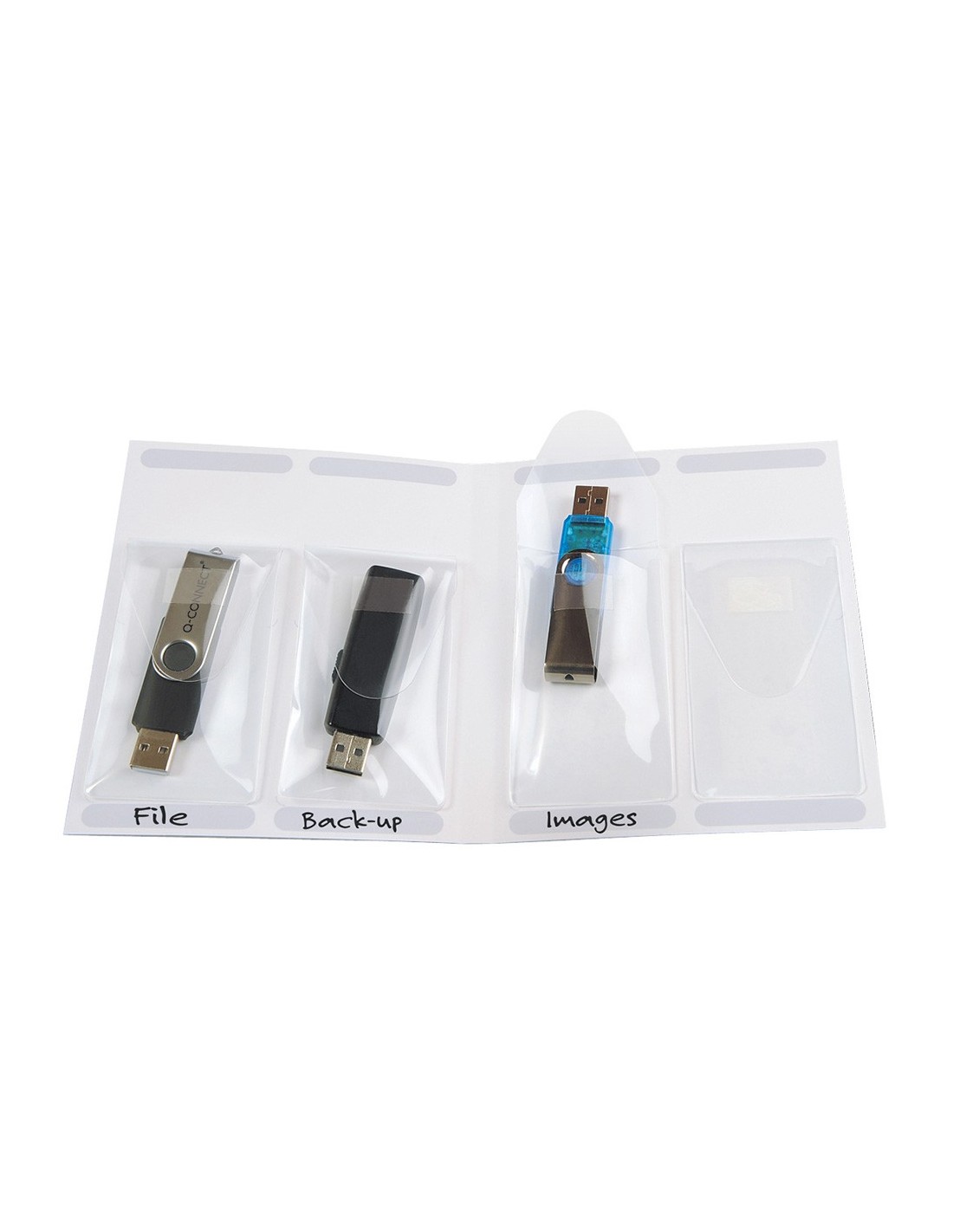 Funda autoadhesiva para dispositivos USB. Se puede pegar sobre cualquier superficie. Permite ordenarlas e identificarlas. Medidas: 52,5 x 90 mm. El pack de 10 fundas.