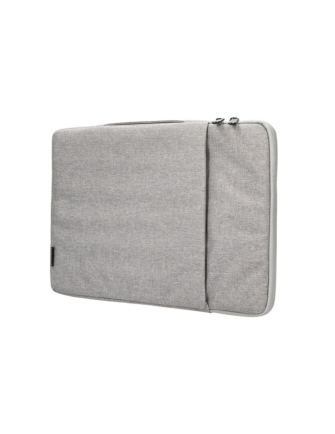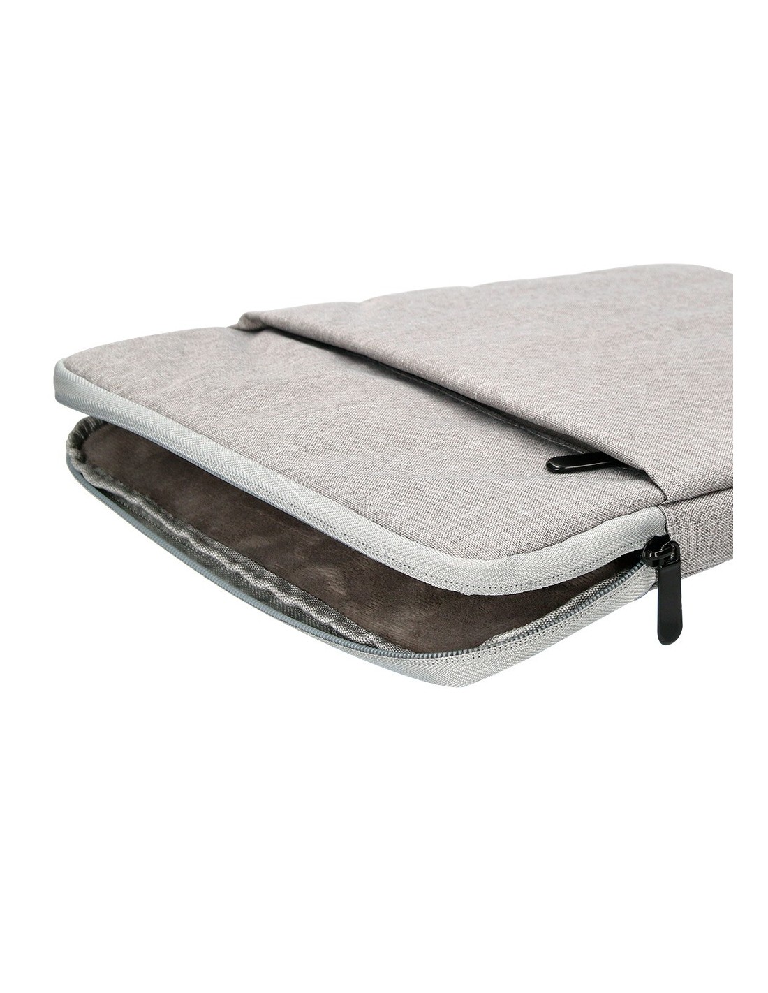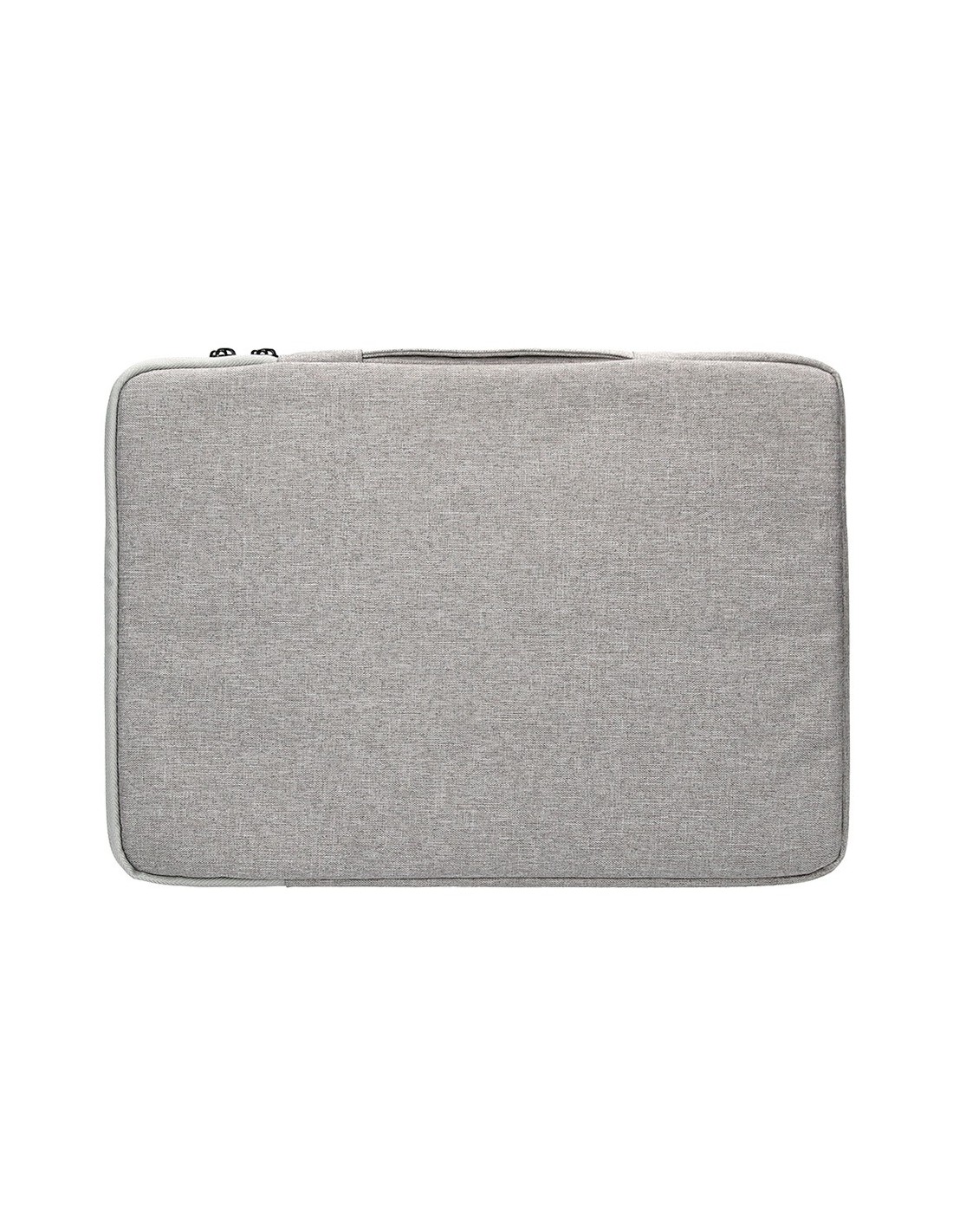 Funda para portátil de 13,3'' en poliéster y forro interior tacto terciopelo. Con asa y compartimento exterior con cierre cremallera para guardar un cargador o pequeños artículos. Color gris claro. Medidas: 350 x 250 x 25 mm.