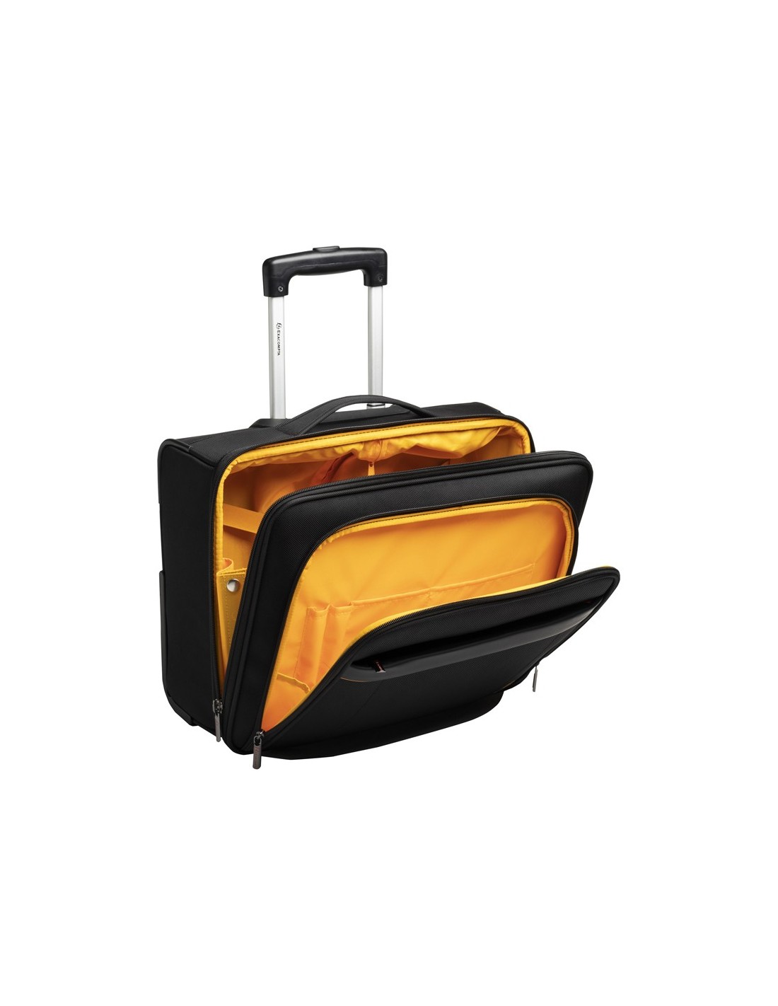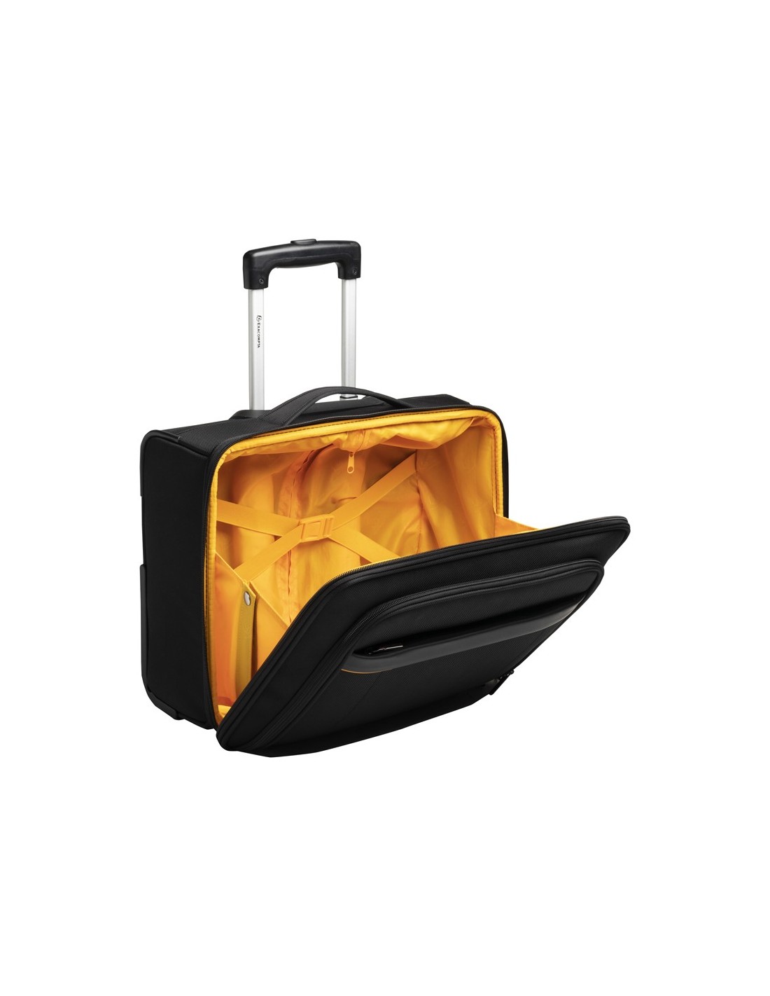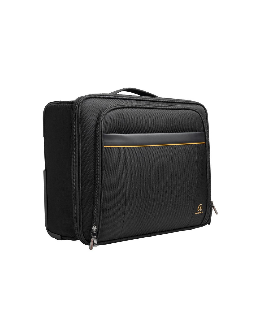 Trolley Exatrolley slim con dos ruedas y con asa telescópica. Tiene un compartimiento principal con un bolsillo acolchado separado para dispositivoshasta 15,6\", así como correas cruzadas para guardar ropa o documentos. Un a cinta en su parte trasera permite apilarlo sobre una maleta. Tejido exterior y forro en poliéster 100% reciclado (RPET) procedente del reciclaje de 20 botellas de plásticos. Capacidad de 17 litros. Certificado GRS. 2 años de garantía.