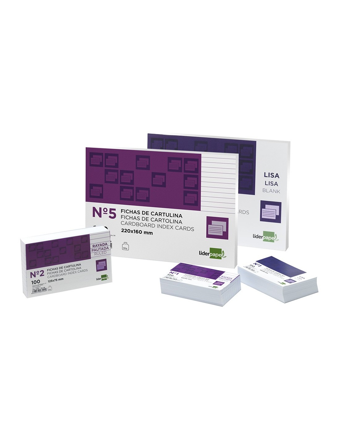 Fichas rayadas y lisas. Cartulina de 180 g/m². Ideal para fichas bibliográficas. Paquetes de 100 hojas.