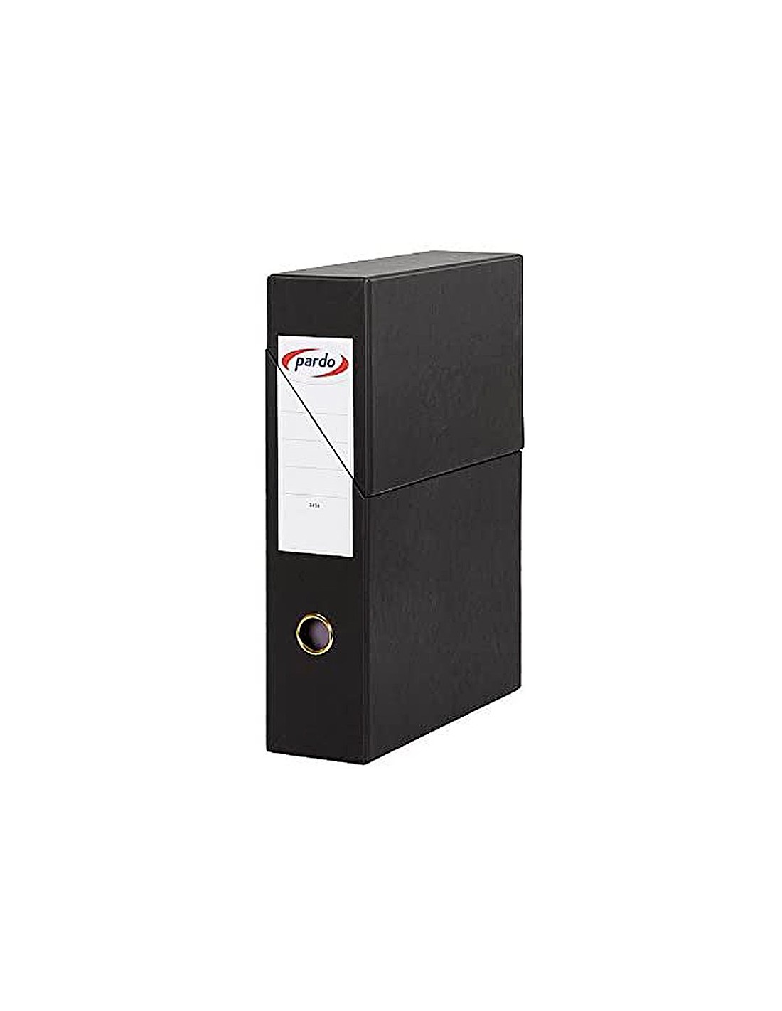 Caja en forma de revistero indicada para archivar. Con doble estuche interior, con ollao y tarjetero. Fabricada en cartón compacto forrado de 2,5 mm de grosor. Medidas: 250 x 335 x 80 mm.