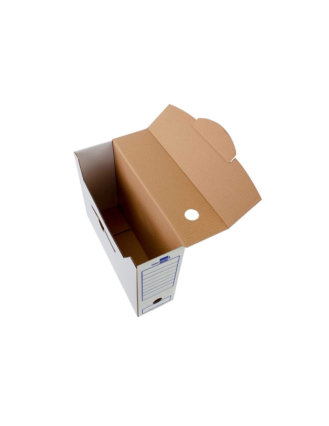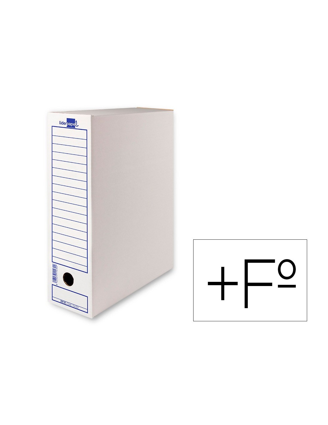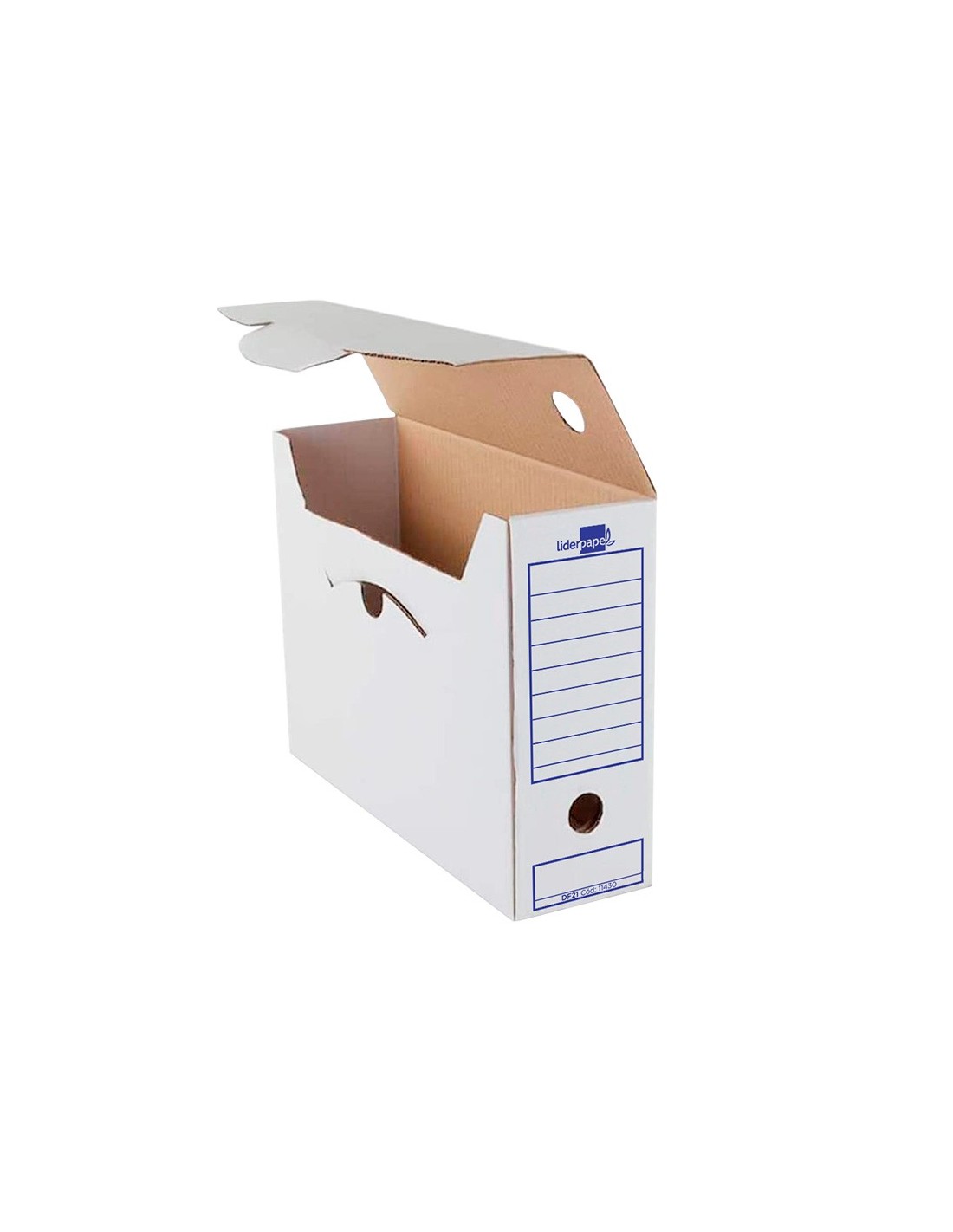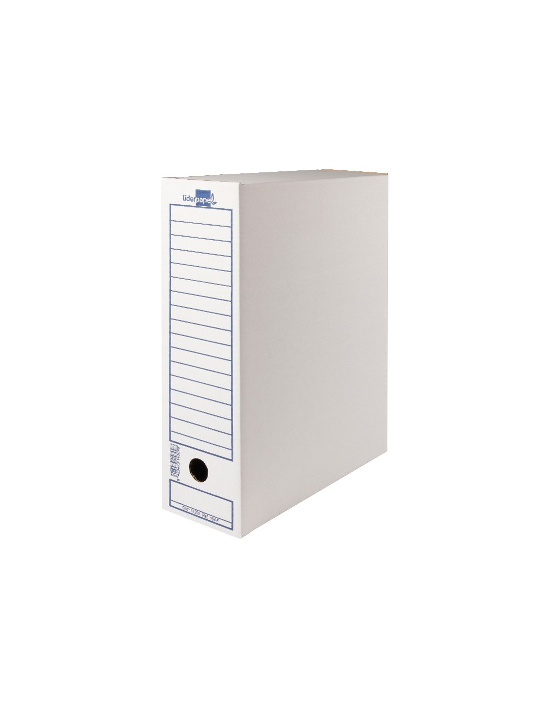 Caja de archivo definitivo para almacenar, organizar y proteger documentosy facturas tamaño folio prolongado. Con sistema de montaje manual muy si mple. Fabricada con cartón ondulado 100% reciclado y reciclable de 325g/m². Esta caja de archivo definitivo en color blanco tiene un lomo de 116 mm y sus medidas son 388x116x275 mm. Con ollao lateral y frontal acompañado de 2 zonas amplías de etiquetaje que permiten almacenarlas tanto en posición vertical como horizontal. Esta caja de archivo definitivo te permitirá conservar tus documentos de forma ordenada al mismo tiempo que ahorrarás espacio, siendo así mucho más eficiente su almacenamiento. Compatible con los cajones contendores Liderpapel 171283 y 171289.