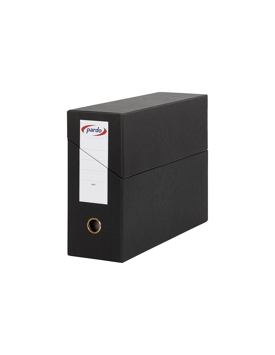 Caja de transferencia horizontal con doble estuche interior. Con ollao en lateral y tarjetero en lomo. Lomo de 80 mm. Fabricada en cartón compacto forrado de 2,5 mm de grosor. Medidas: 390 x 270 x 115 mm.