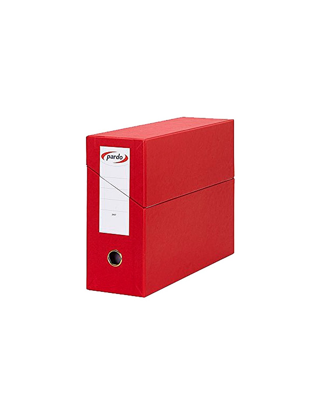 Caja de transferencia horizontal con doble estuche interior. Con ollao en lateral y tarjetero en lomo. Lomo de 80 mm. Fabricada en cartón compacto forrado de 2,5 mm de grosor. Medidas: 390 x 270 x 115 mm.