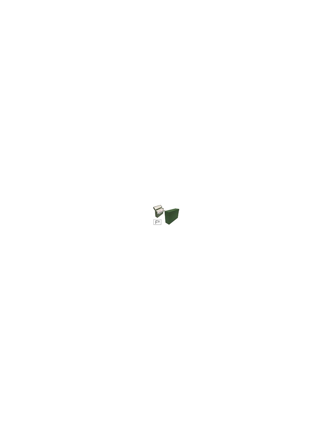 Caja de transferencia fabricada en cartón forrado en geltex. Con índice en la tapa abatible. Lomo de 200 mm. Color verde. Medidas: 390 x 255 x 200 mm.