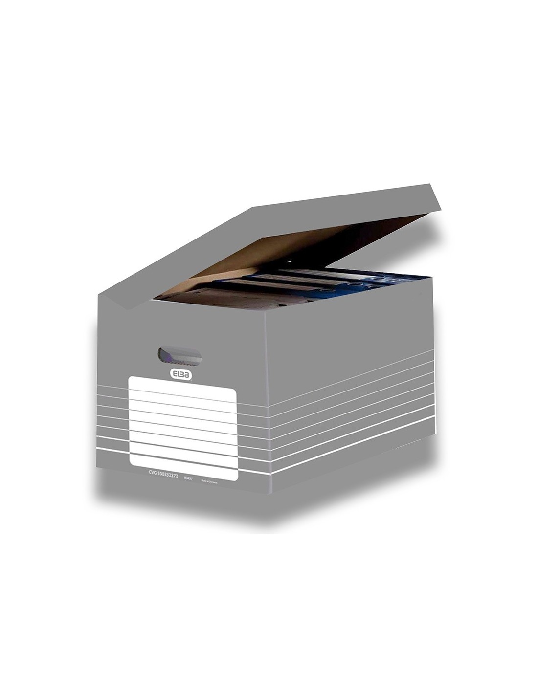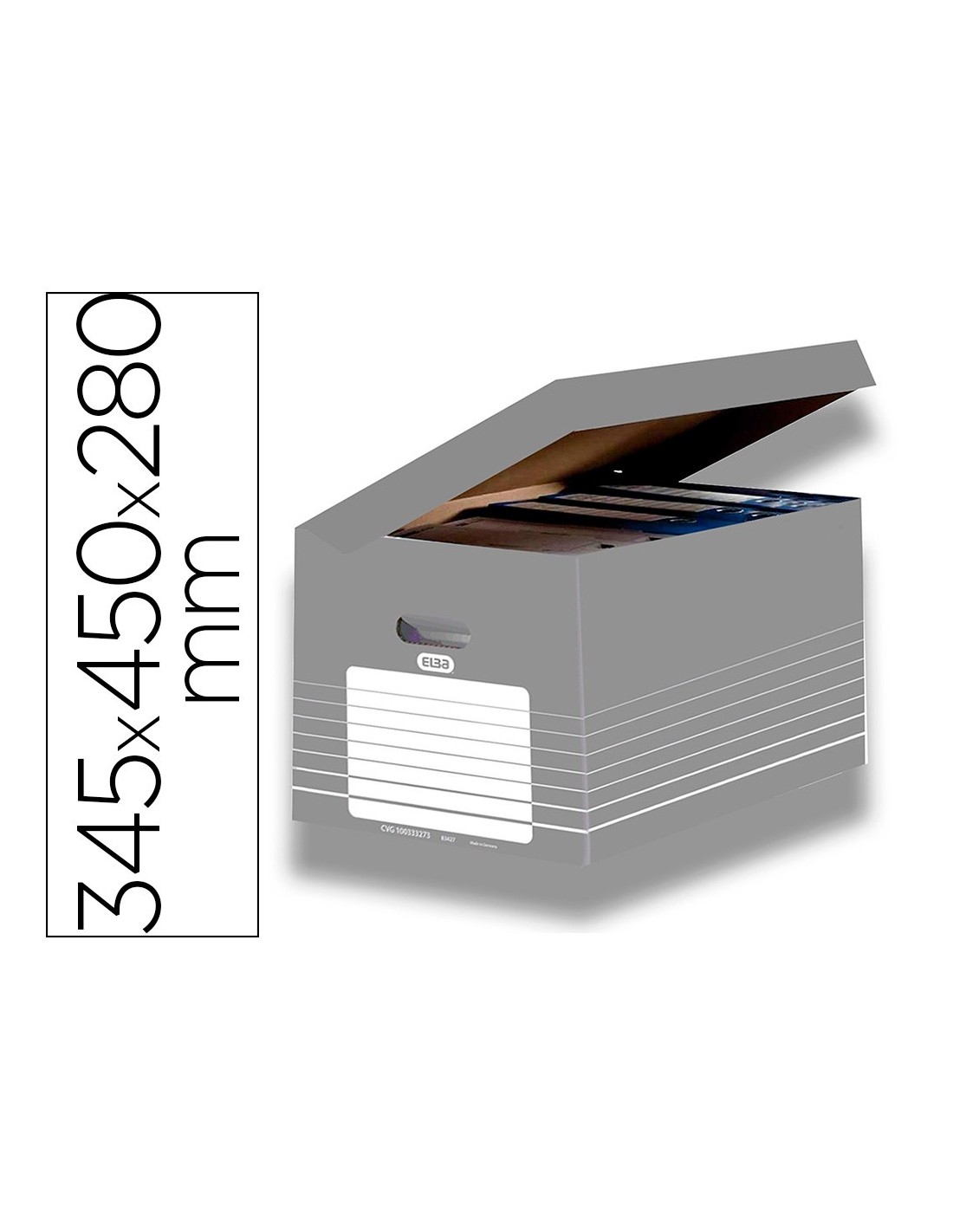 Caja contenedor con tapa integrada automontable de gran capacidad, fabricada en cartón con impresión para identificar los documentos. Con asas para facilitar su transporte. Montaje fácil y rápido. Permite guardar 5 ARCHIVADORES A-Z de 100 mm de lomo. Tamaño folio. Color gris. Cartón d e 450 g/m². Medidas: 450 x 345 x 280 mm. Interior: 448 x 343 x 277 mm.