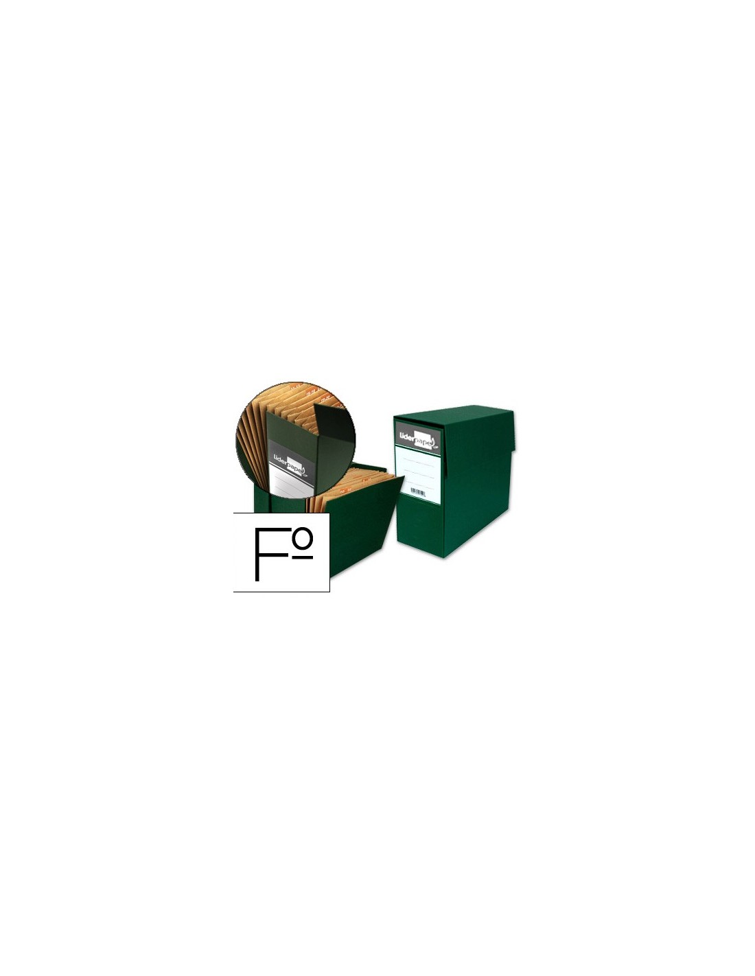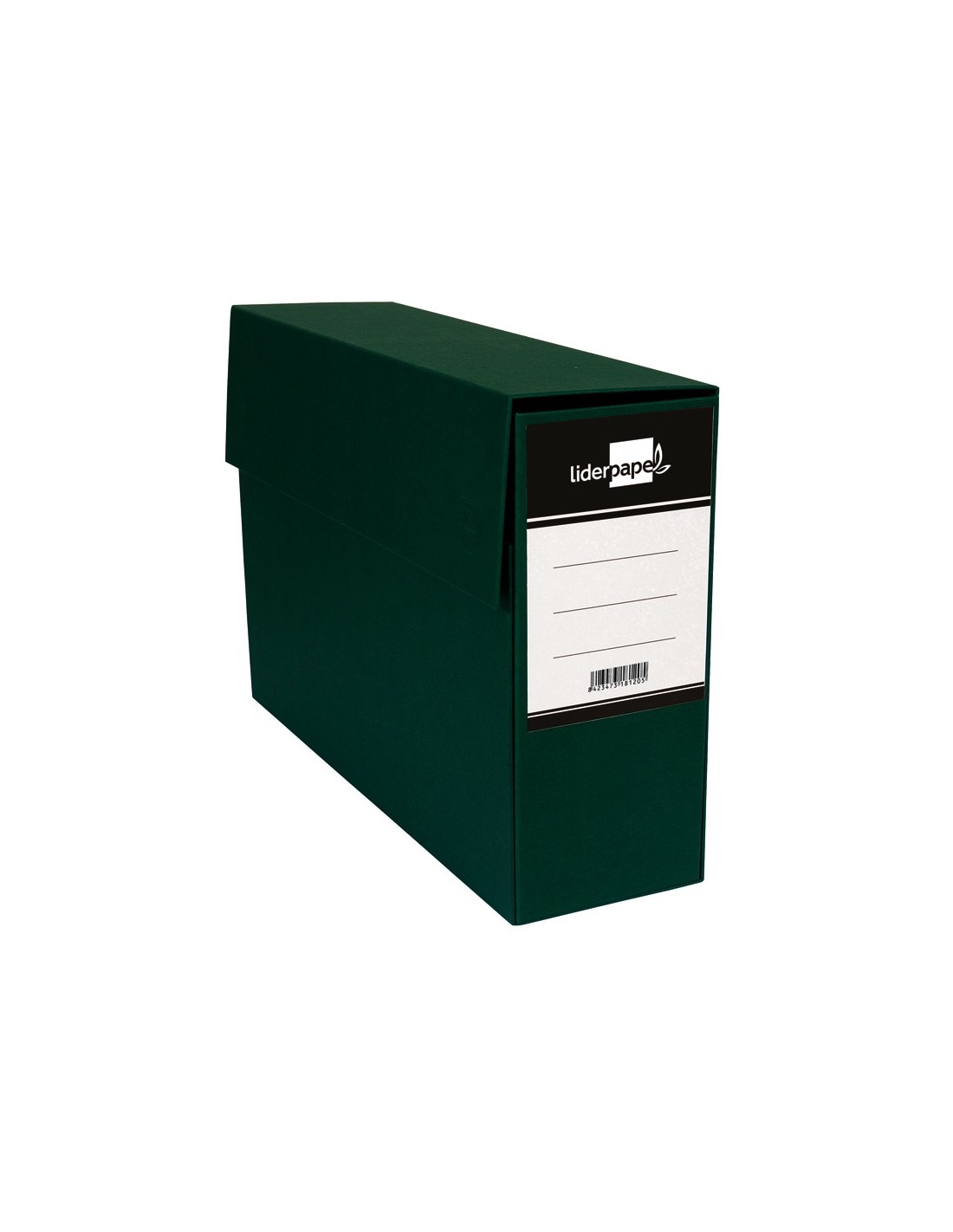 Amplios contenedores. Forrada en Paper Coat de 2 mm de espesor. Etiqueta impresa. Color verde. Tamaño folio.