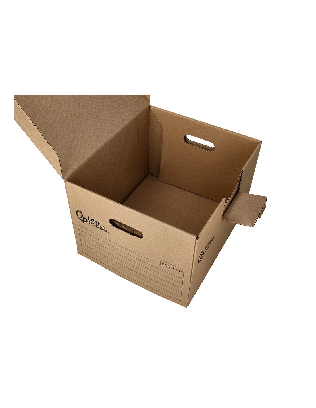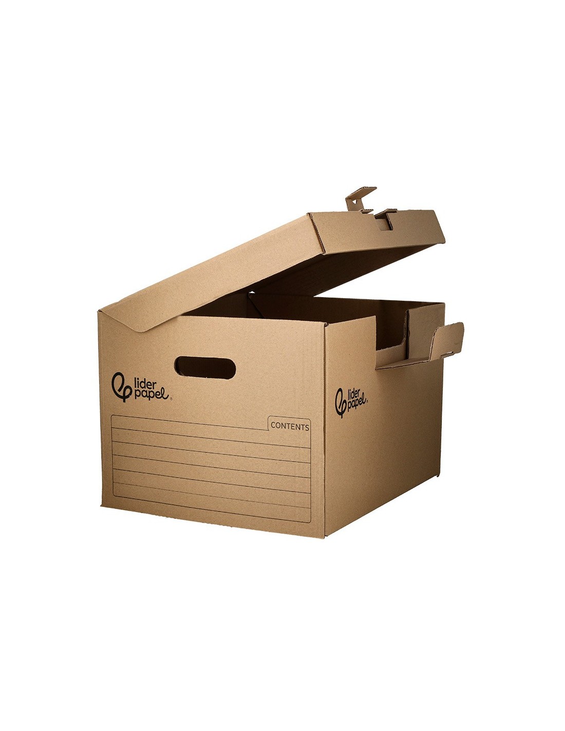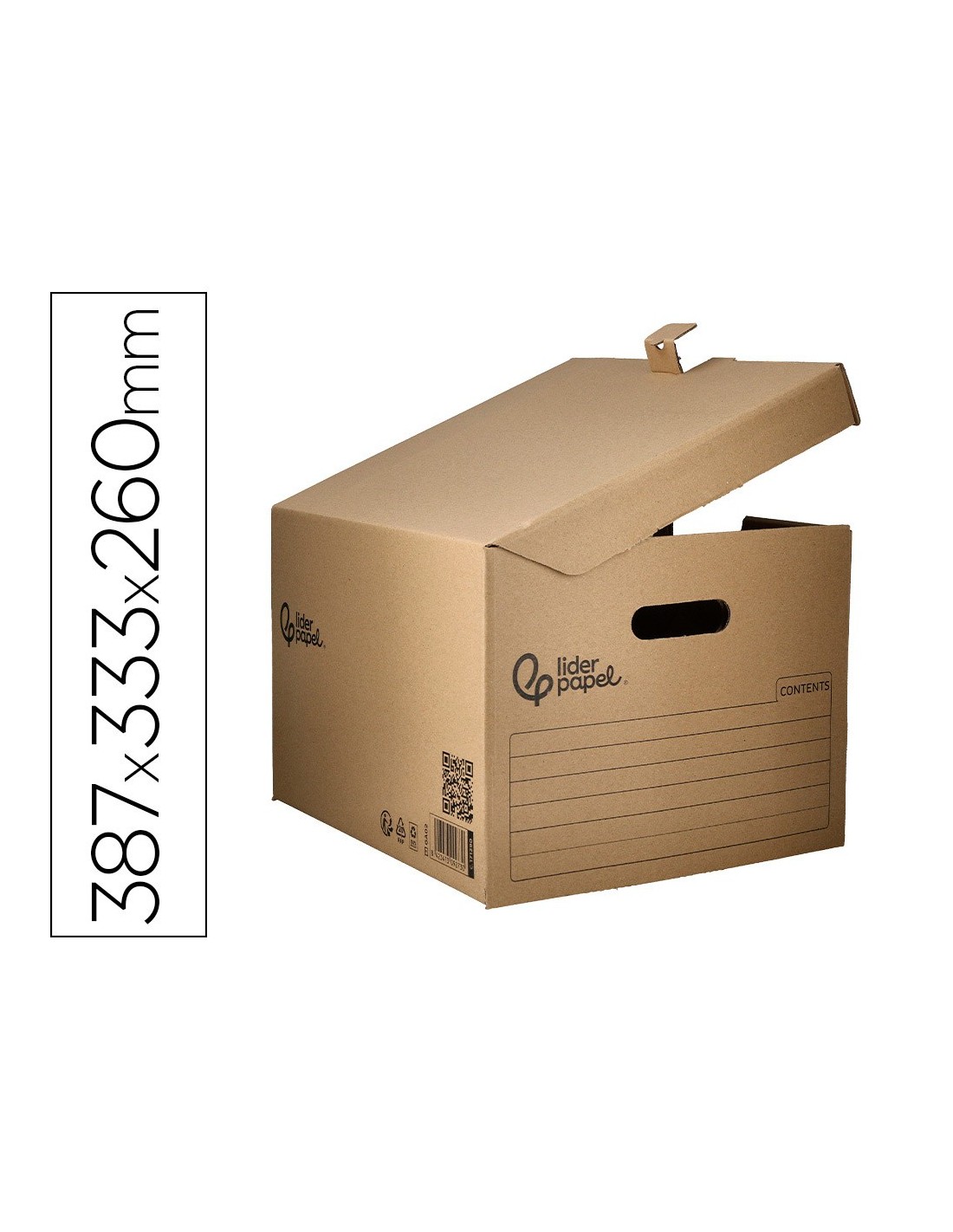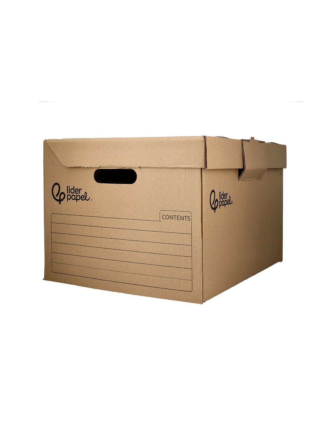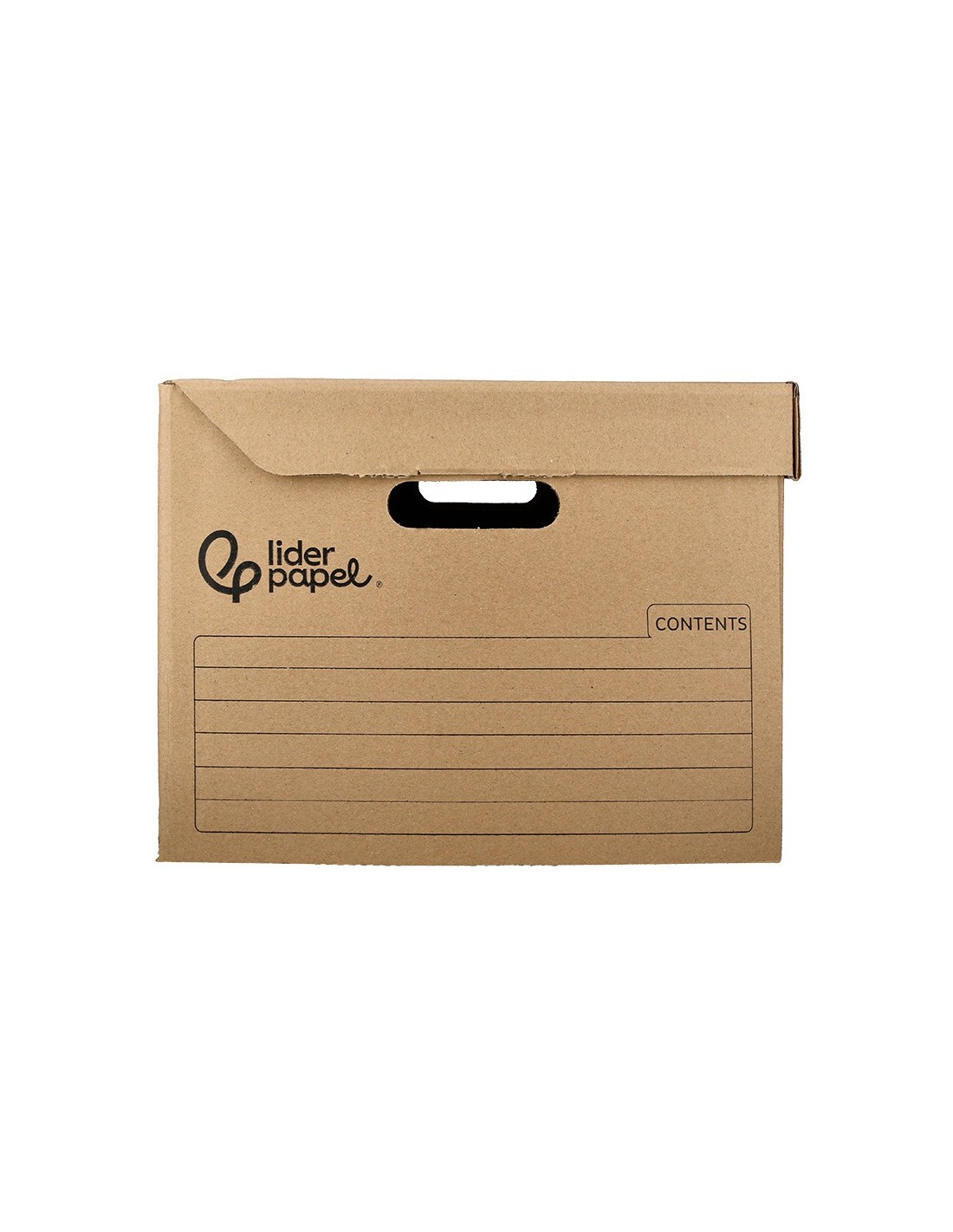Cajón contenedor de archivo. Ideal para almacenar documentos, carpetas y archivo defintivo. Montaje manual sencillo y rápido sin necesidad de cinta o adhesivos. El cajón tiene un código QR que redirigirá a un video con lasinstrucciones de montaje. Con tapa fija y cierre con lengüeta para una ma yor seguridad y resistencia. Tiene asas en los laterales para que puedas transportarla de forma cómoda y segura. Con zona de etiquetaje para poder identificar los archivos u objetos almacenados en su interior. Este cajón contenedor tiene capacidad para 3 cajas de archivo defintivo tamaño folio o3 archivadores A-Z. Este cajón contenedor color kraft está fabricado en c artón 100% reciclado y reciclable. Las medidas de la caja son 387x333x260 mm. Cartón de 512 g/m².