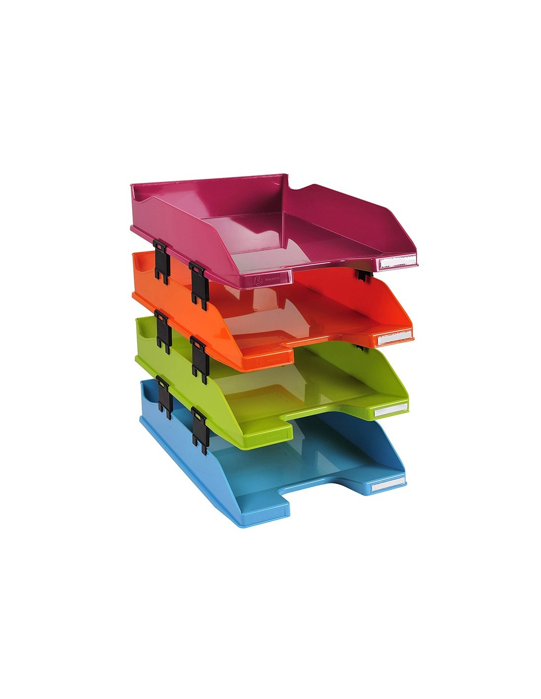 Juego de 4 bandejas de correo Combo para documentos DIN A4+. Colores opacos surtidos. Suministrado con 12 elementos de superposición para poder aumentar la capacidad de documentos. Resistente, estable. Superponibles en vertical o en escalera, compatible con la mayoría de módulos del mercado. Portaetiqueta suministrado. Medidas: 243 x 254 x 346 mm.