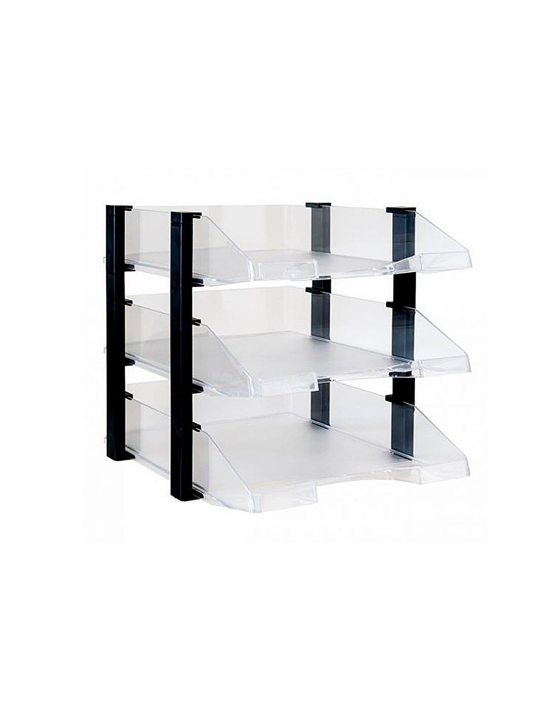 Conjunto de 3 bandejas con separadores sostenibles Archivo 2000 JumboRack. Fabricado en poliestireno de gran calidad y resistencia. Separación entre las bandejas de 40 mm. Separadores fabricados con materia prima 100% reciclada y reciclable. Válida para formatos A4 y folio. Se suministra sin montar. Color de las bandejas cristal transparente y separadores en negro. Medidas exteriores: 350x285x280 mm. Fabricado en España.