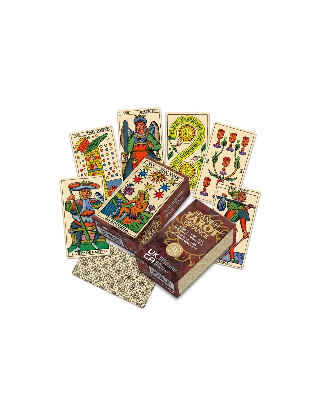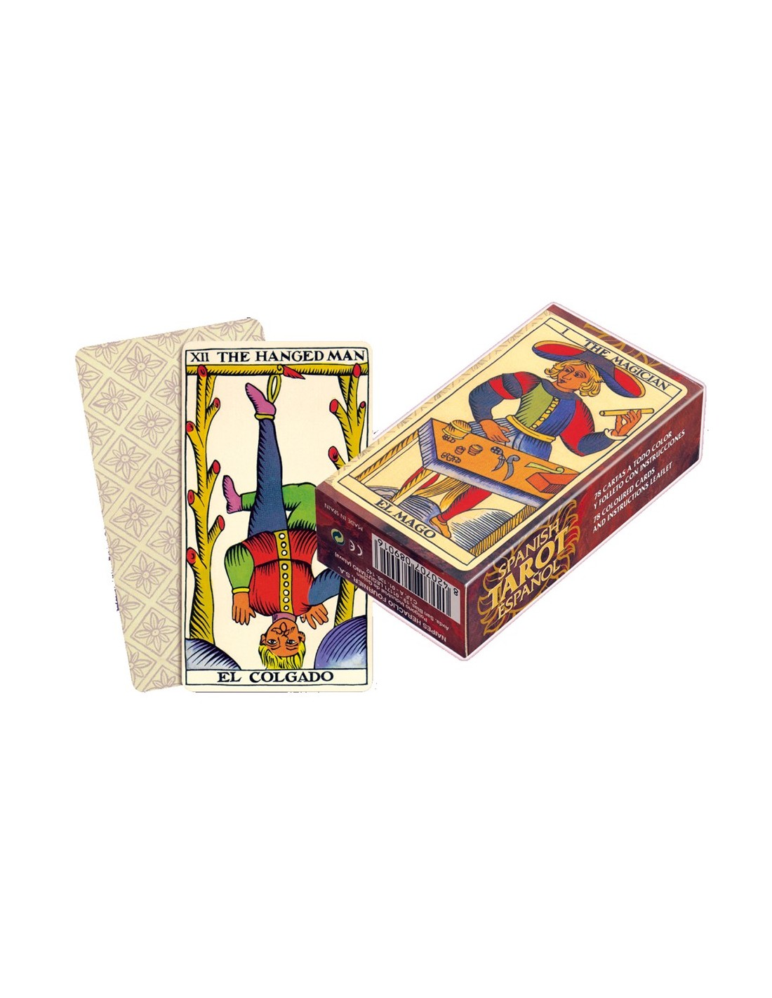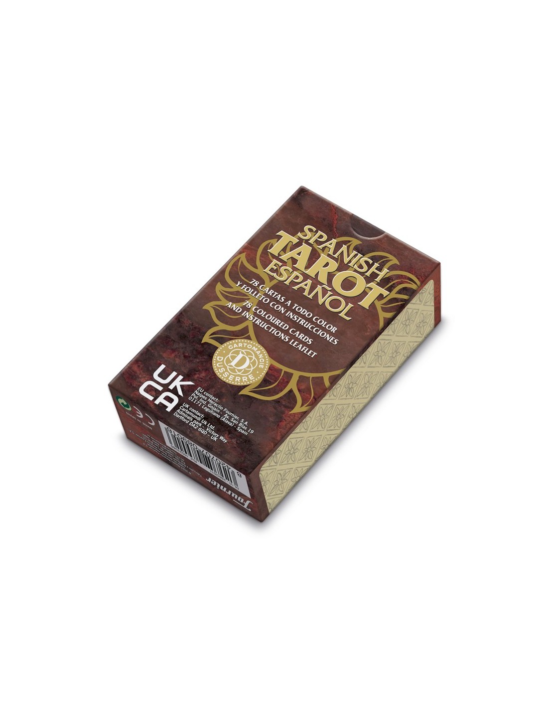 Consta de 78 cartas divididas en 22 arcanos mayores y 56 arcanos menores. En estuche de cartón. Incluye manual de instrucciones.