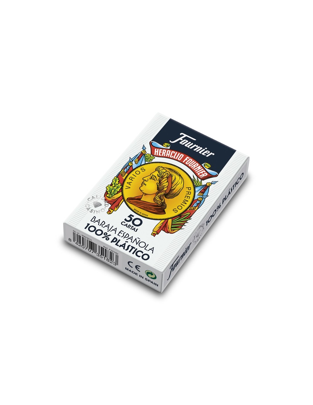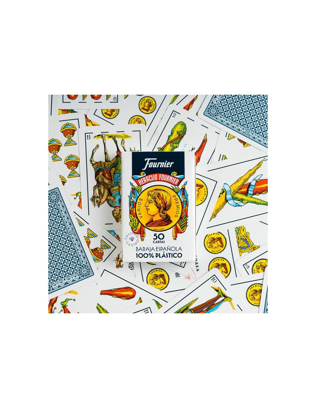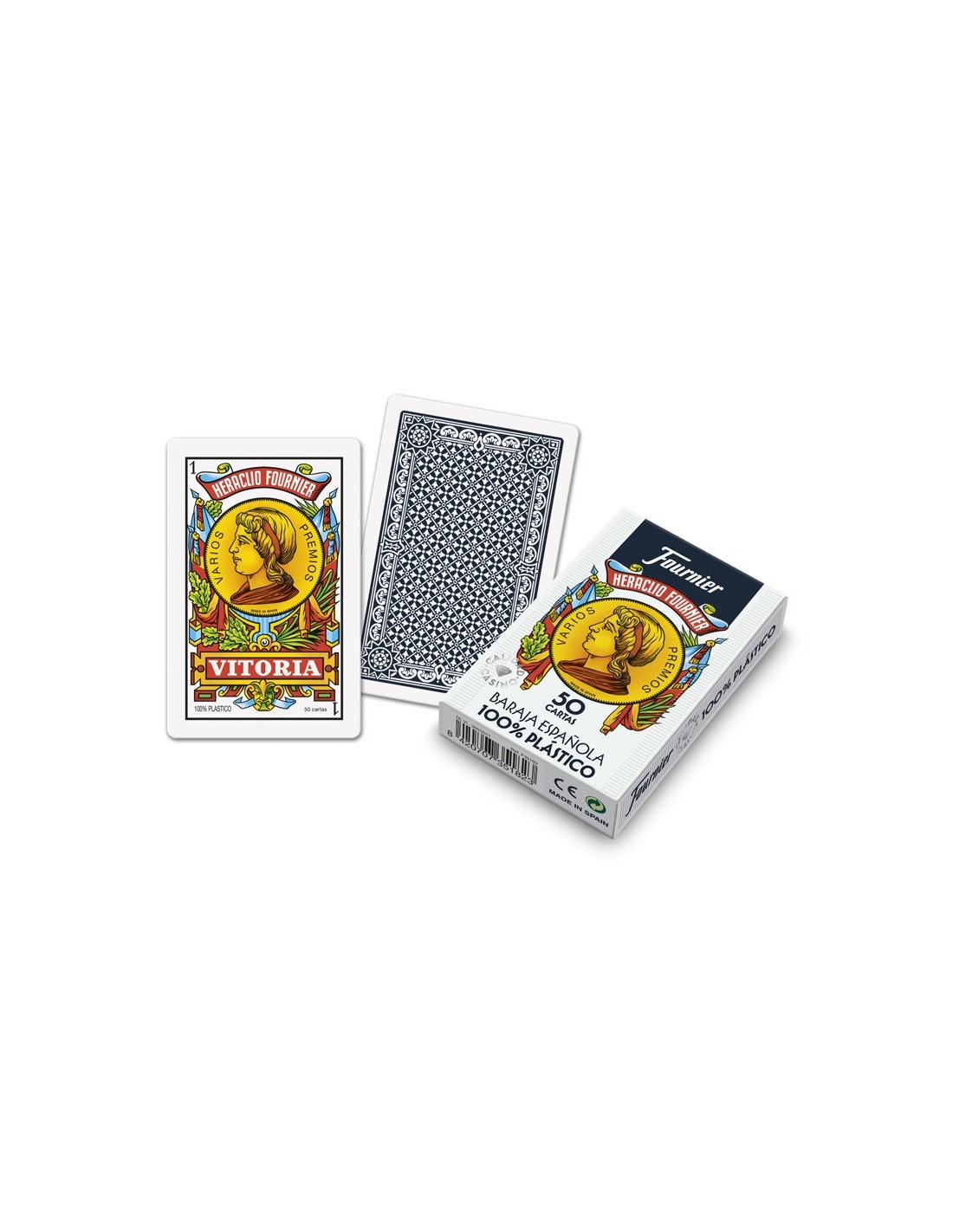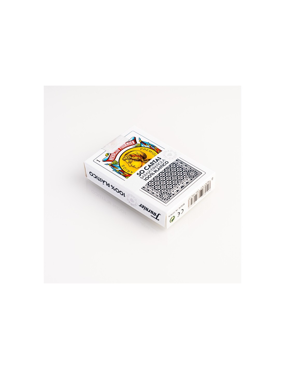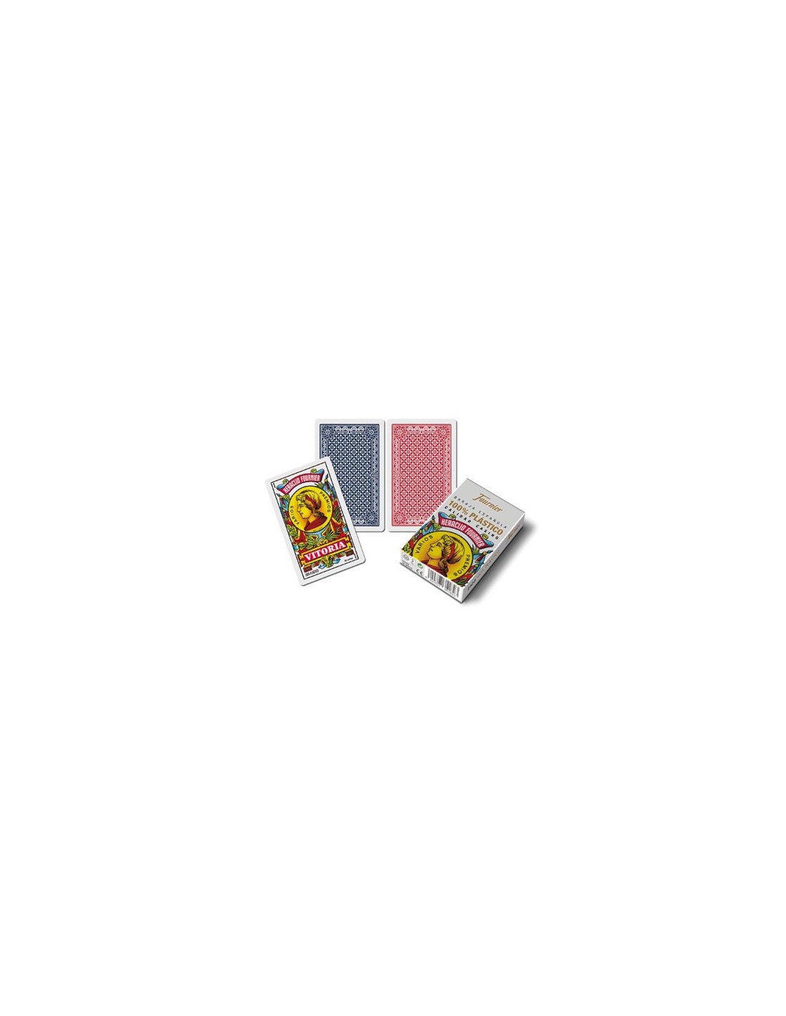 Baraja de 50 cartas. 100% plástico. Color del reverso azul. Estuche de cartón. Medidas de la carta: 61,5 x 95 mm.