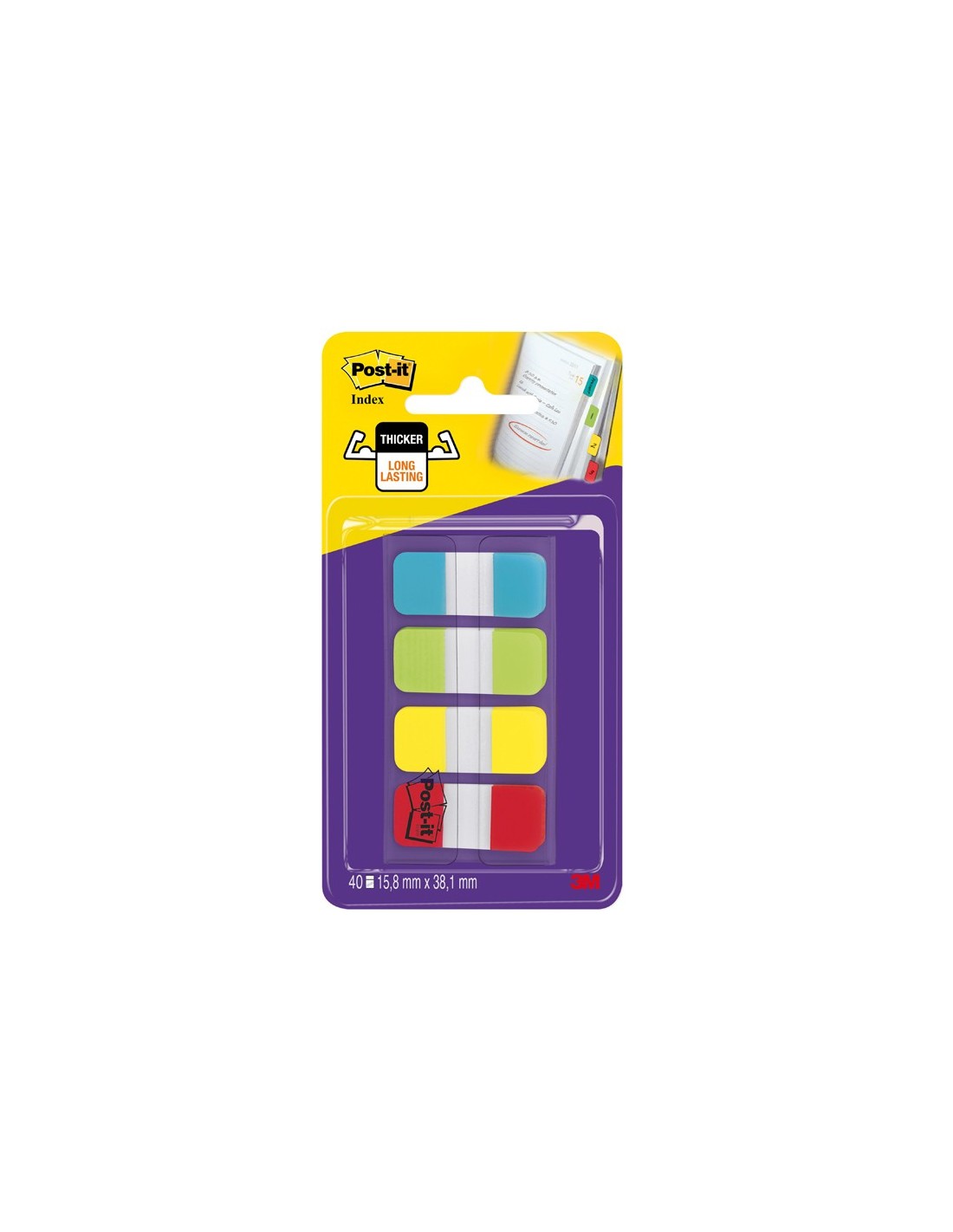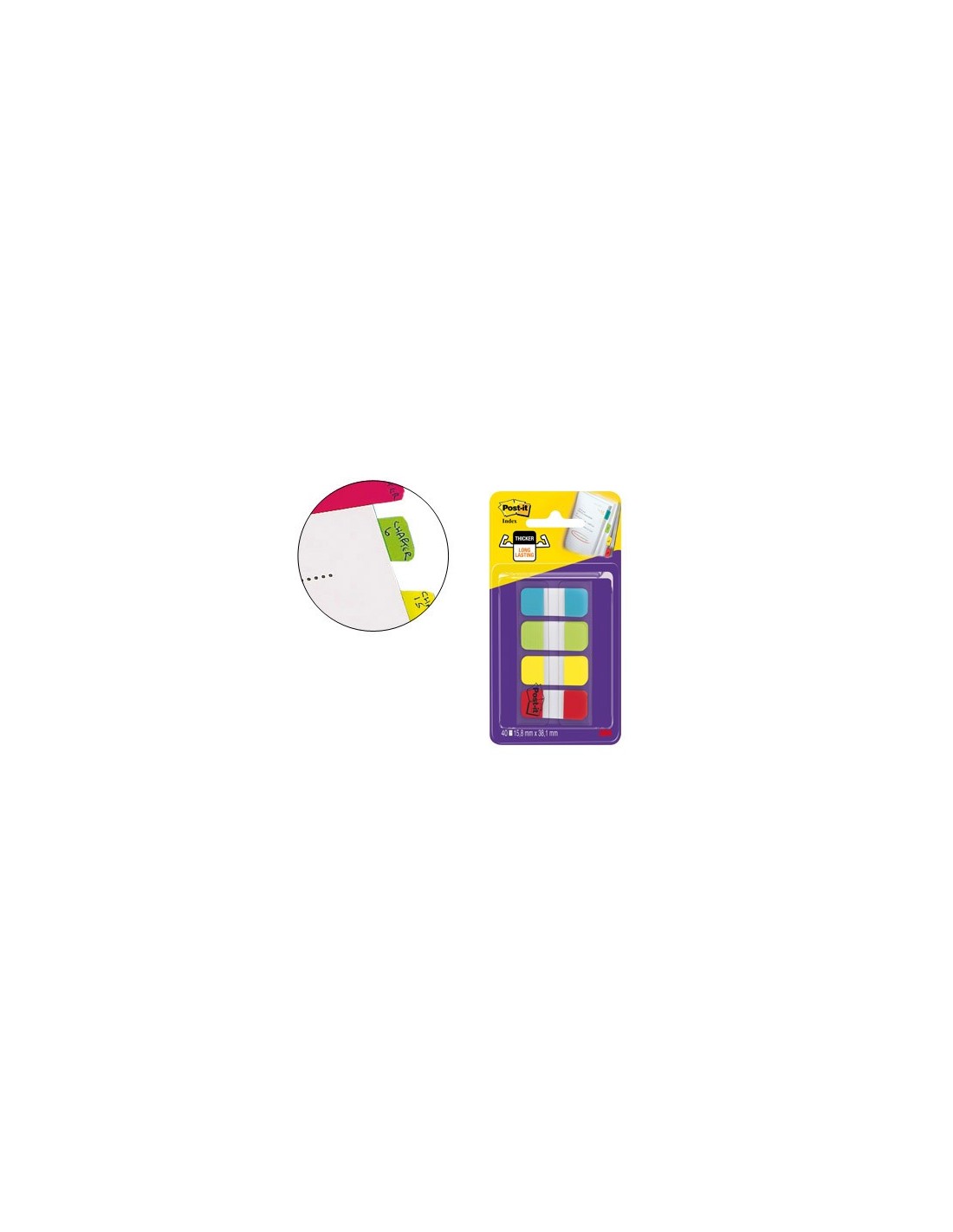 Gruesas y resistentes. No se arrugan ni doblan con el tiempo. Ideales para clasificar y archivar, organizando el trabajo de forma duradera. Medidas: 38,1 x 15,8 mm. El pack con 4 colores con 10 banderitas por color.