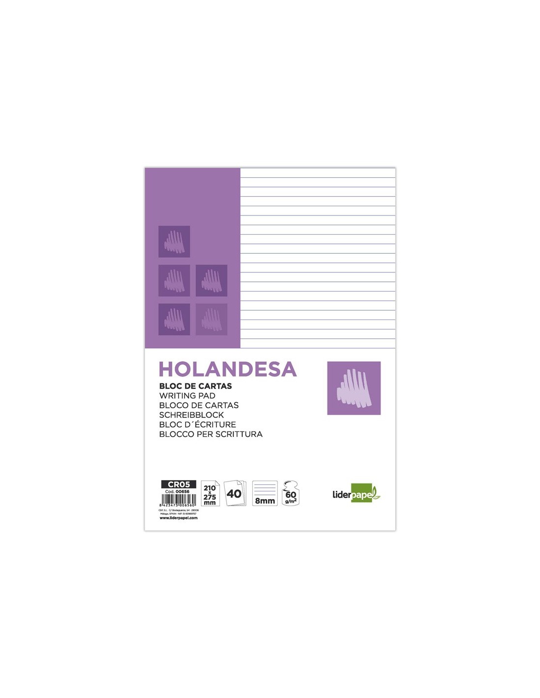 Holandesa. Papel de 60 g/m². Rayado horizontal. Encolado. Enlomado. Indicado para escribir cartas. El bloc de 40 hojas.