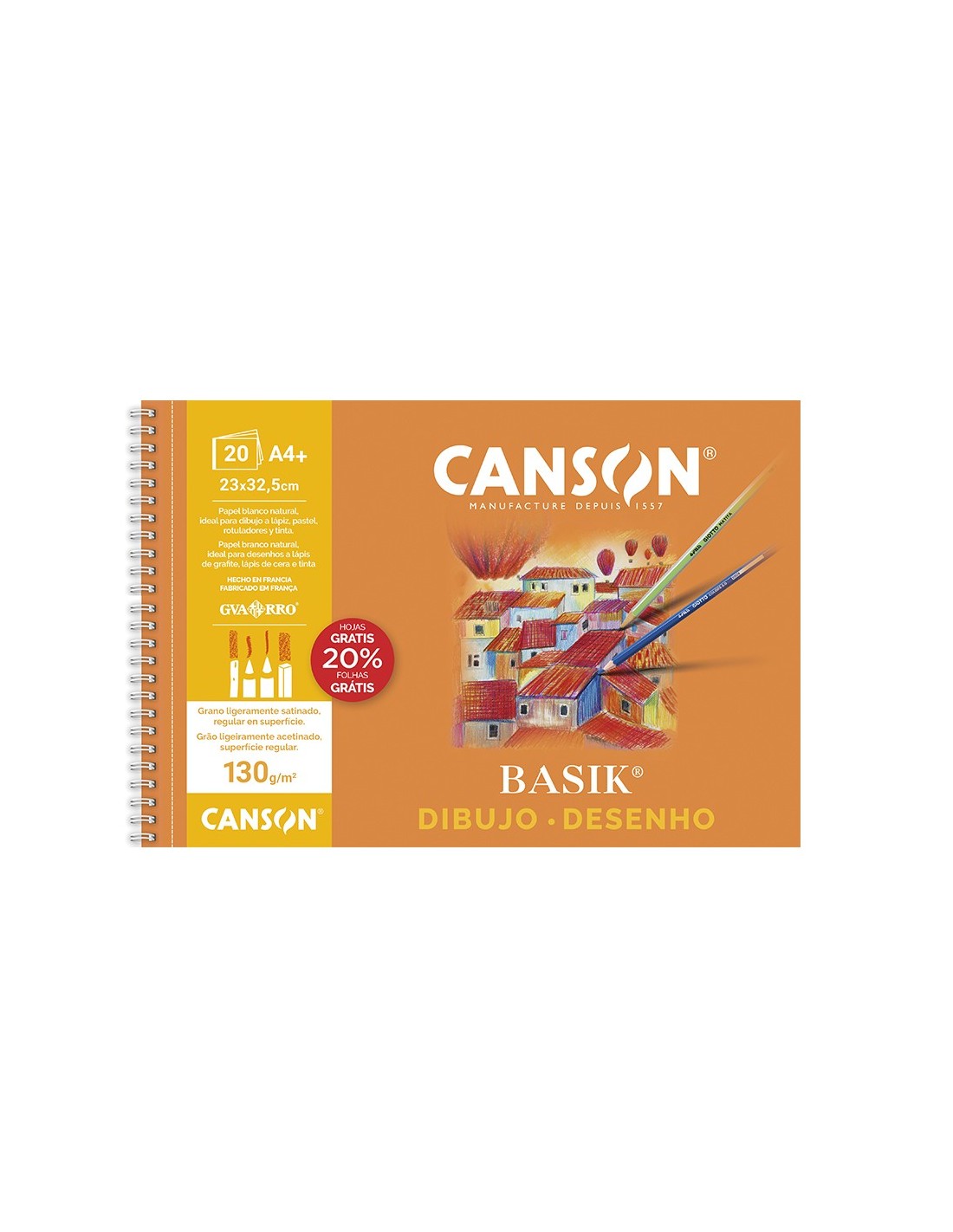 Formato Din A4+. 20 hojas. 130 g/m². Papel blanco natural, que ofrece dureza y regularidad en su superficie. Ligeramente satinado. Idóneo para dibujo a lápiz, tinta y ceras. Microperforado. Sin recuadro.