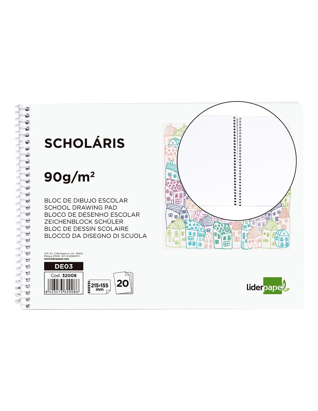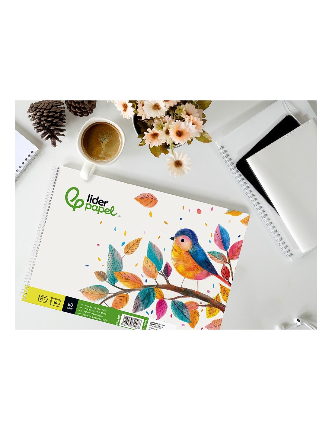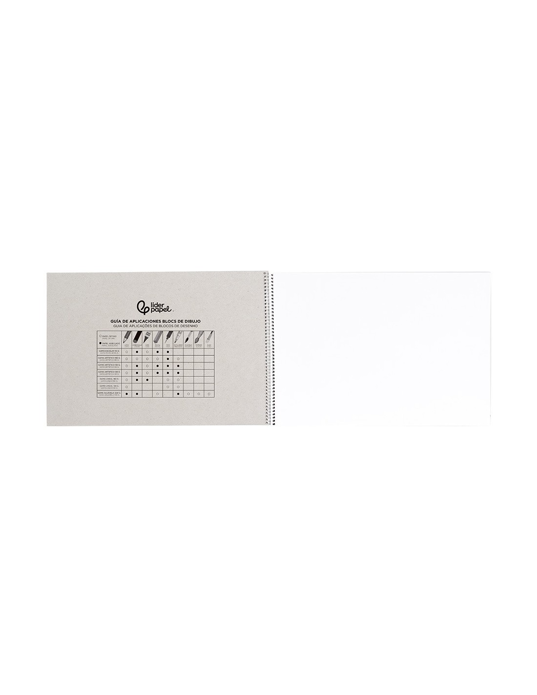 20 hojas. 90 g/m². Papel muy blanco de superficie regular. Acepta cualquier instrumento de dibujo: lápiz, cera, carboncillo, pastel, tinta, etc.