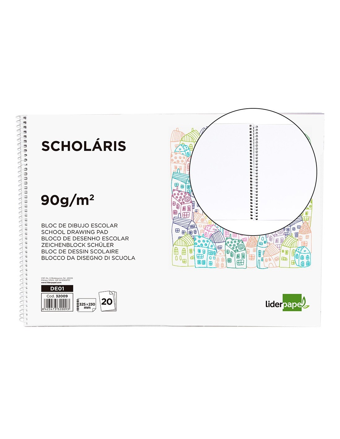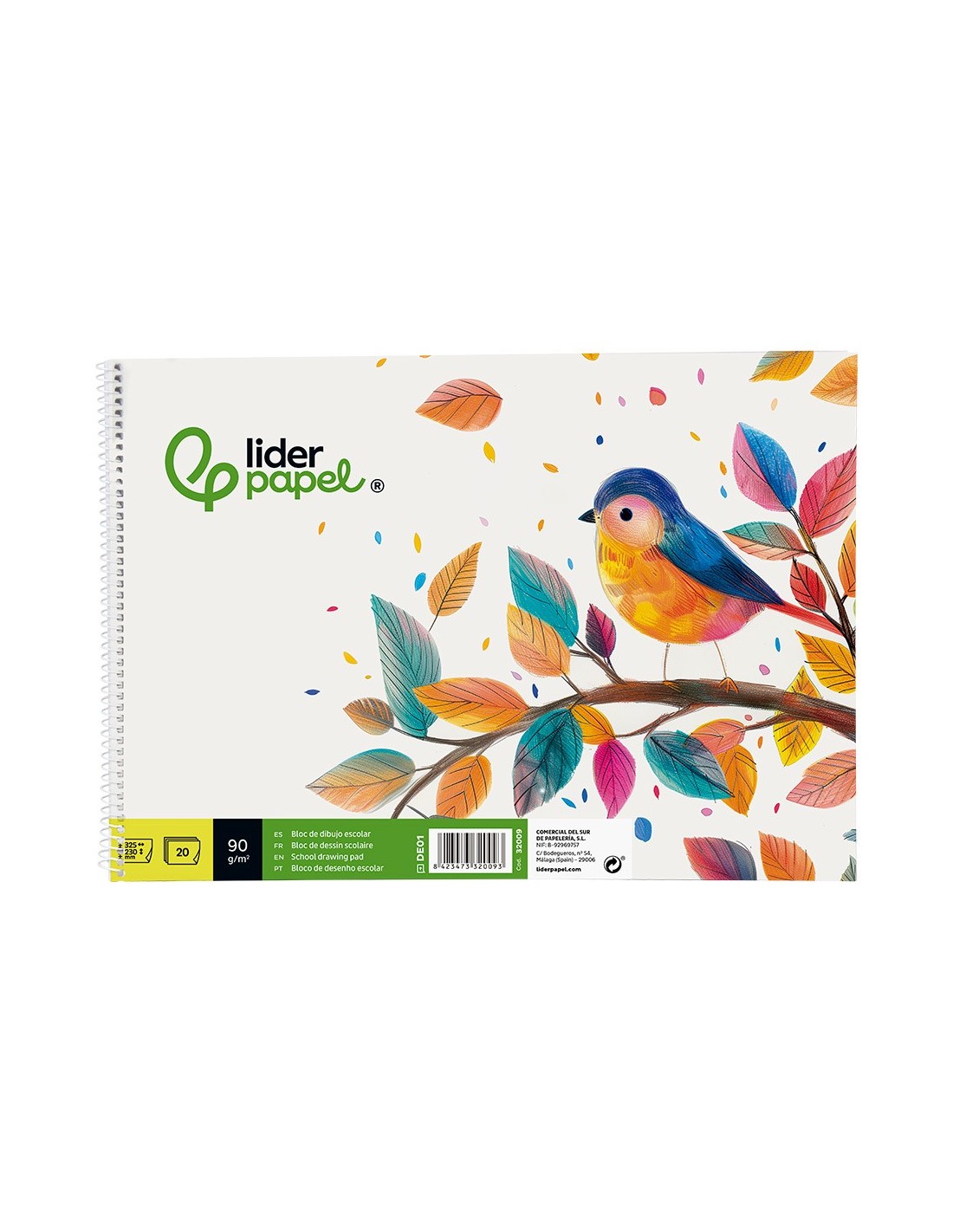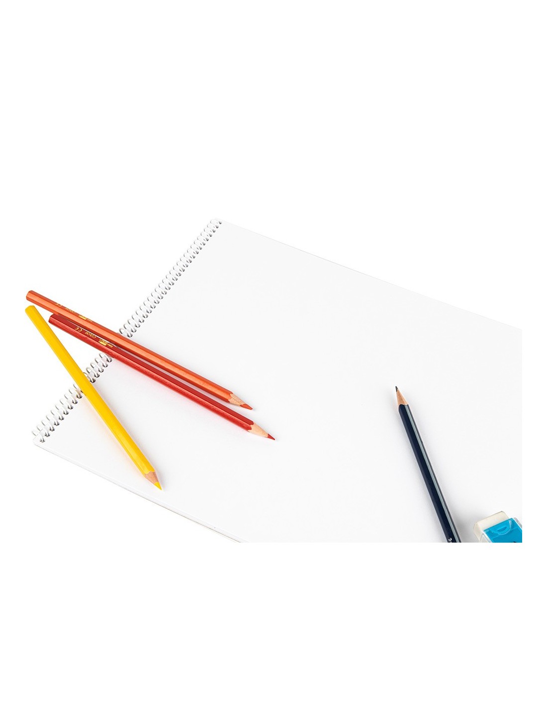 20 hojas. 90 g/m². Papel muy blanco de superficie regular. Acepta cualquier instrumento de dibujo: lápiz, cera, carboncillo, pastel, tinta, etc.