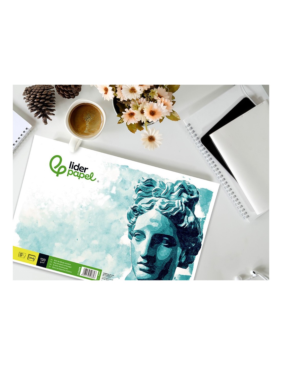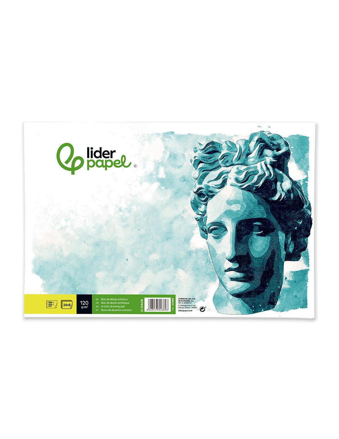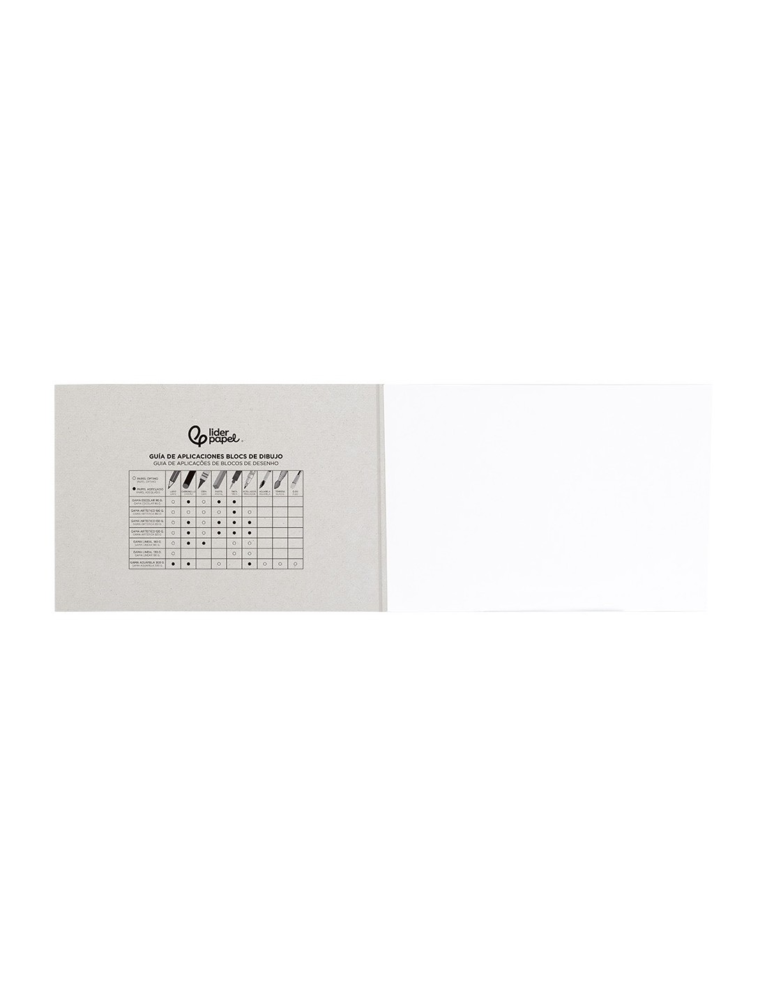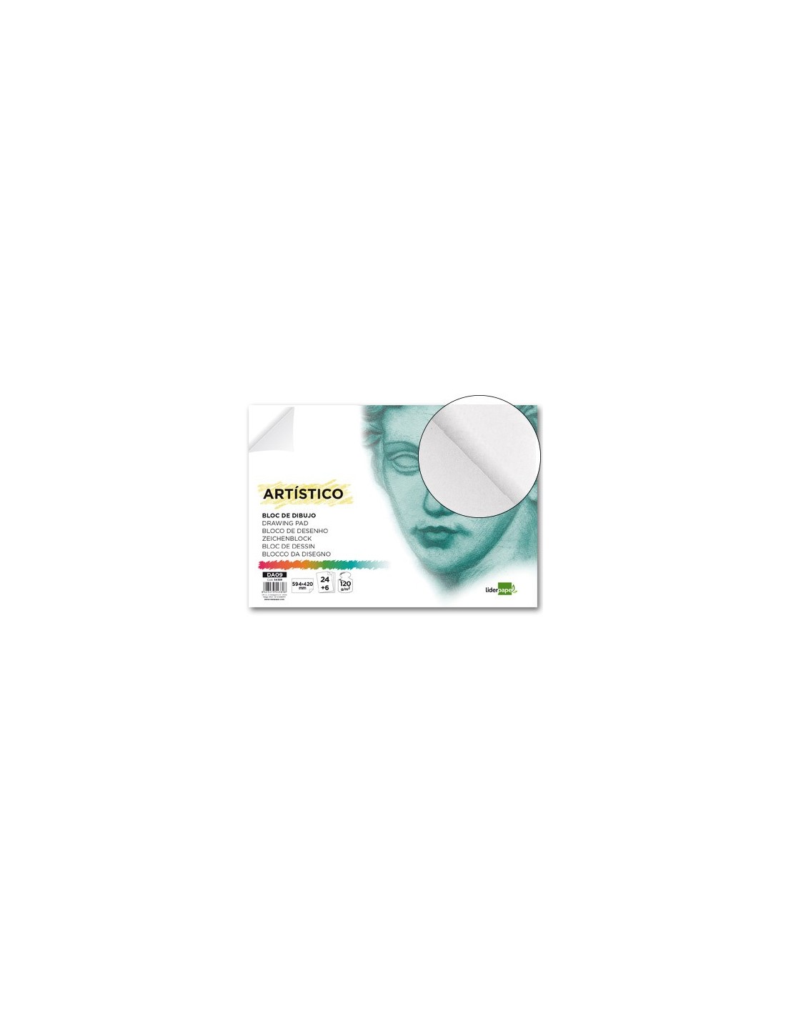 24 + 6 hojas. 120 g/m². Papel blanco de ligero tono crema. Su cuerpo y textura lo hacen adecuado para lápiz, grafito, ceras y colores. Sin recuadro.