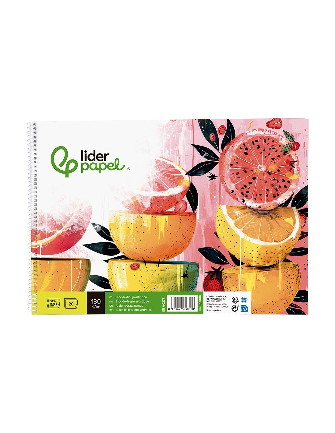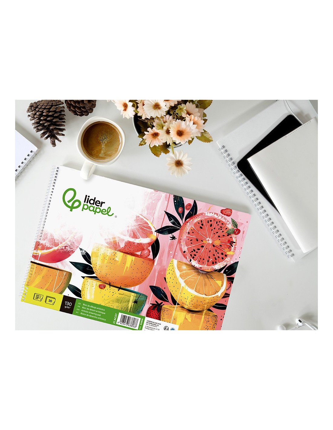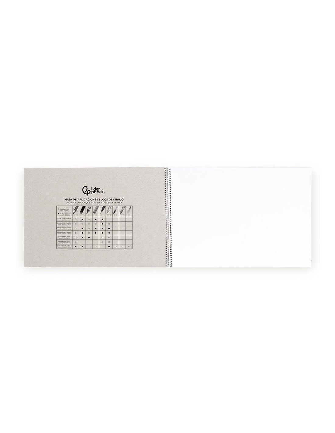 Tamaño folio. 20 hojas. 130 g/m². Papel blanco, sin microperforado. Su cuerpo y textura lo hacen adecuado para lápiz, grafito, ceras y colores. Sin recuadro.