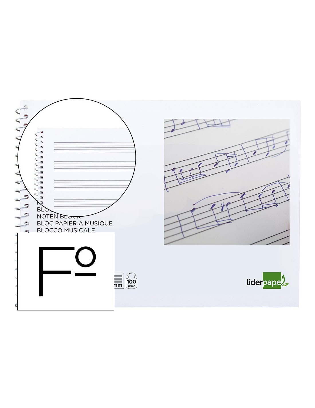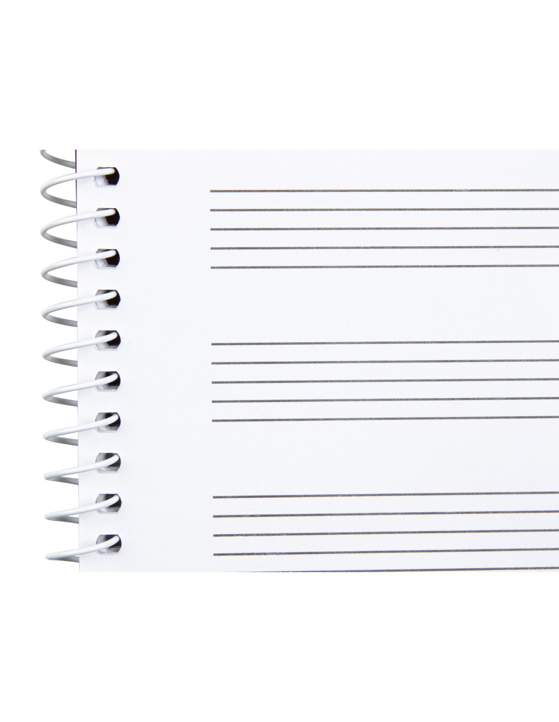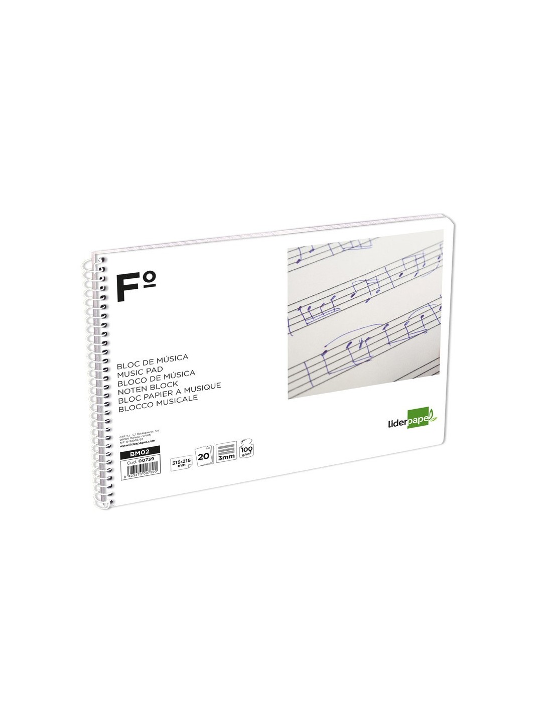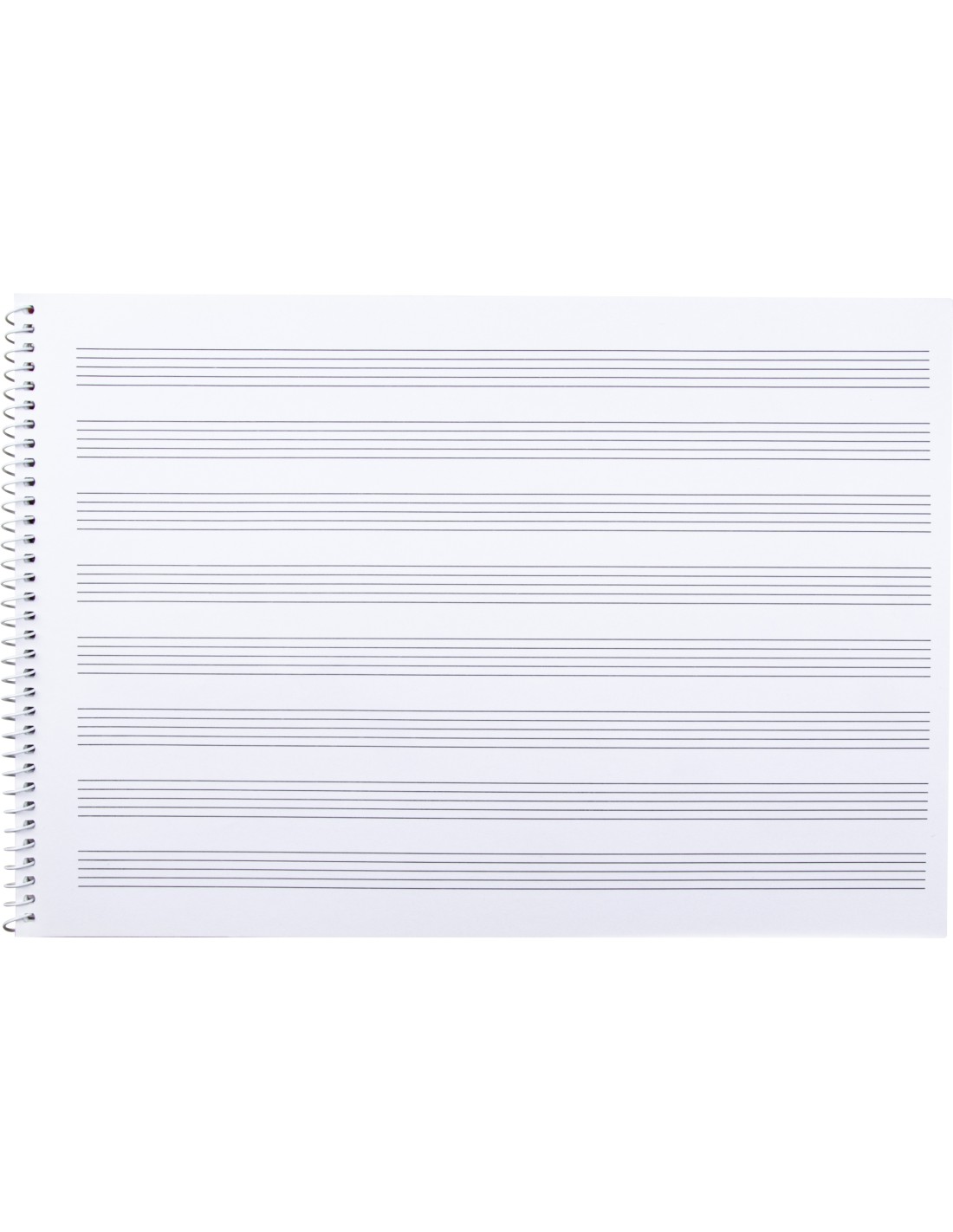 Tamaño folio apaisado (315 x 215 mm). 20 hojas. Papel de 100 g/m². Impresión pentagrama de 3 mm de interlineado. 8 pentagramas por página.
